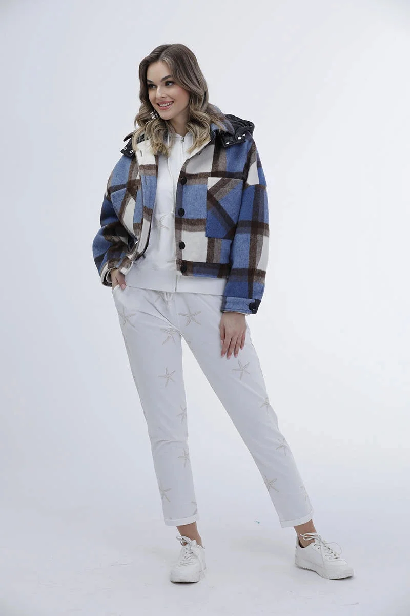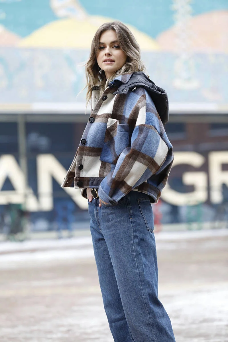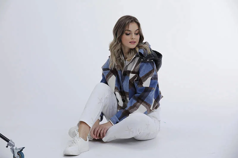 Bunda má střih typu "oversize", má límec, dvě kapsy bez zapínání a zapíná se knoflíky. Rukávy jsou olemované manžetami. Model má délku do pasu a má podšívku.