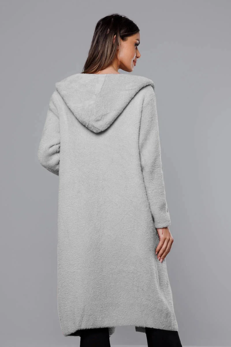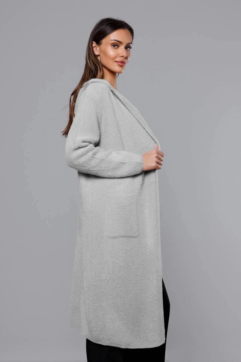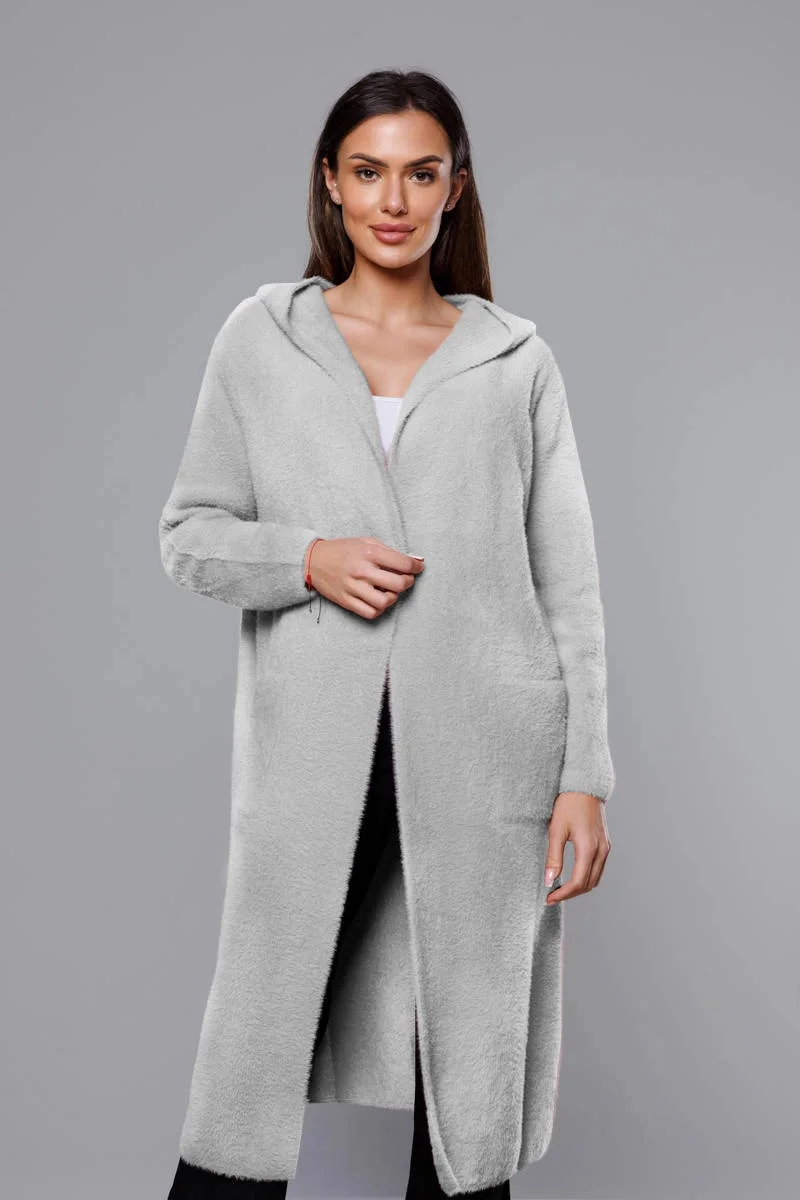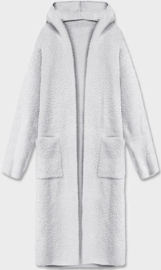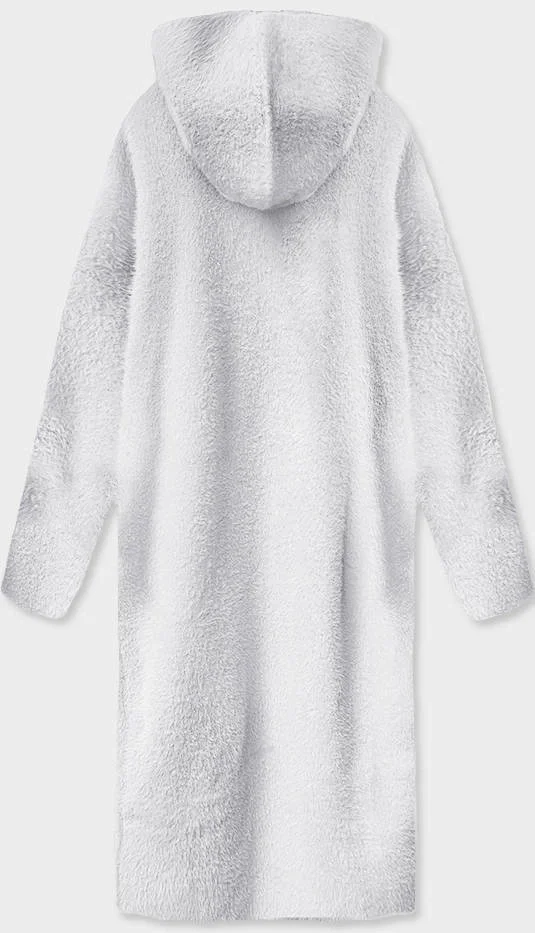 Světle šedý dlouhý vlněný přehoz přes oblečení typu alpaka s kapucí (M105-1)
