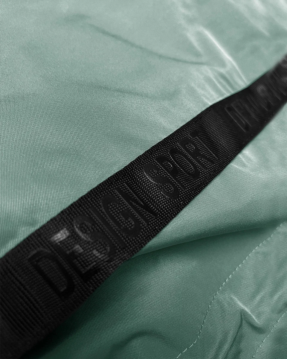 Bunda je zateplená tenkou vrstvou syntetické péřové výplně, má dvě kapsy a zapíná se zipem a panelem s patentkami. Model má kapuci, kterou není možné odepnout. V pase modelu je stahující šňůrka. Bundu je možné ve spodní části na bocích rozepnout. Model má délku do poloviny stehen.