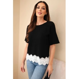 Tento dámský svetr s krátkým rukávem a jemným krajkovým zakončením je ideální volbou pro ženy, které si cení eleganci a pohodlí na každý den. Delikátní krajka na spodním okraji dodává blůzce půvab a ženský charakter, což ji činí skvělou nabídkou jak do práce, tak na setkání s přáteli.