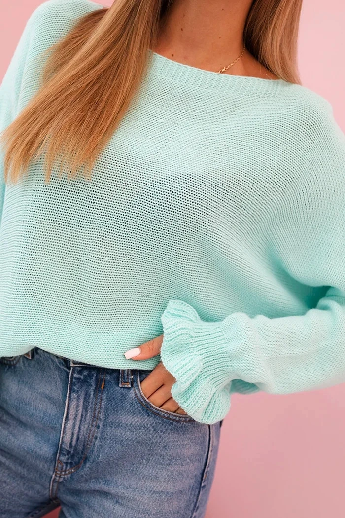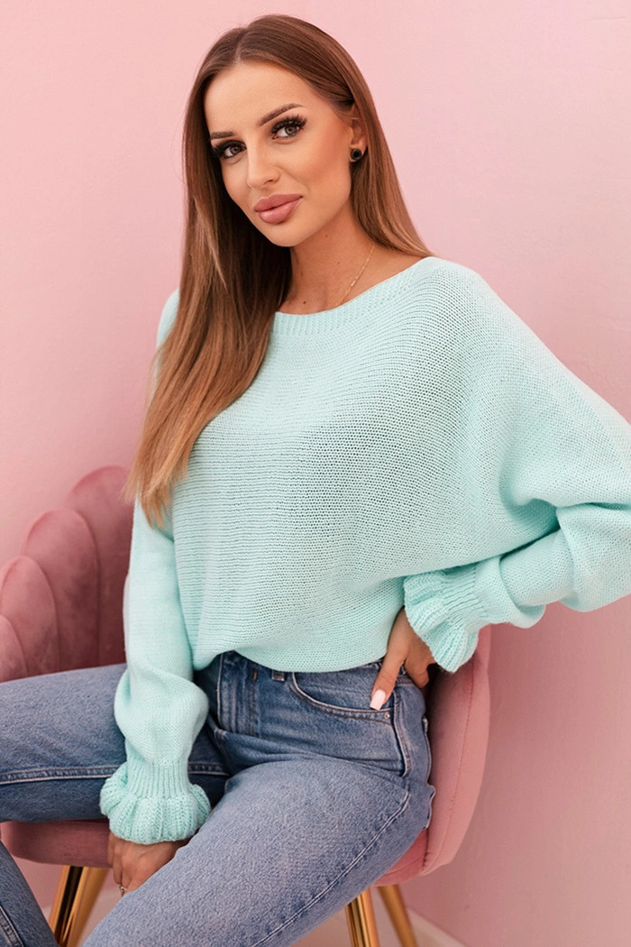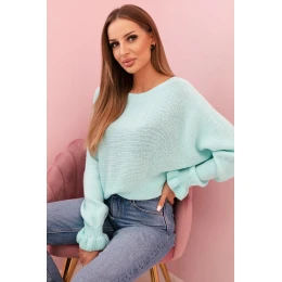 Svetr dámský z mohéru s nařasenými rukávy a výstřihem na zádech mátový