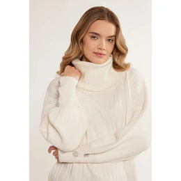 Dámský rolák volného střihu s ozdobným prošitím, vyrobený z materiálu příjemného na dotek. Golf s dlouhými, mírně nadýchanými rukávy s bižuterními knoflíky na koncích. Tento model bude jistě fungovat i v chladném počasí. Modelka na obrázku je 177 cm vysoká a má velikost 36.