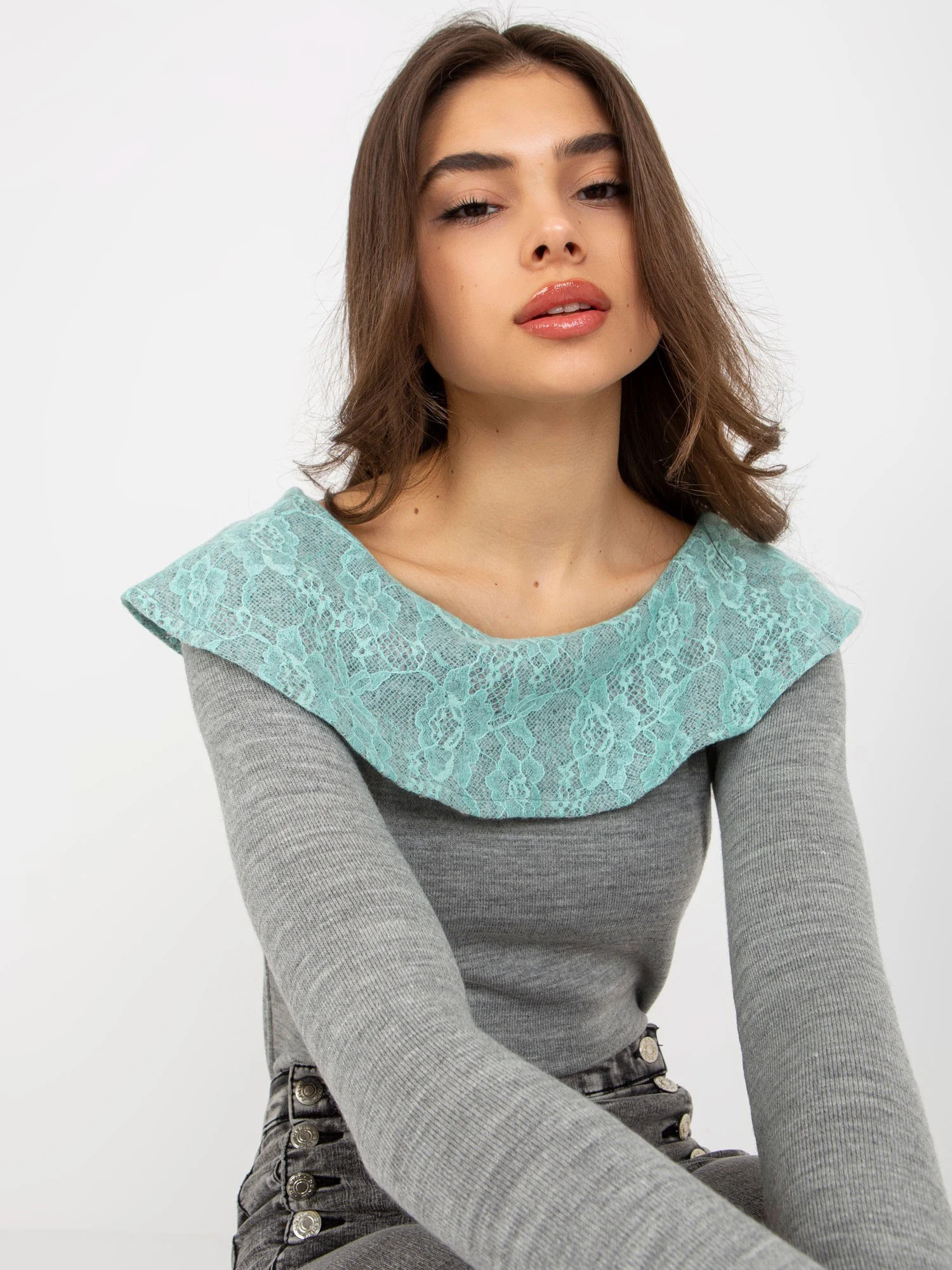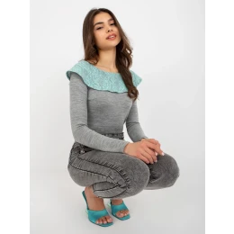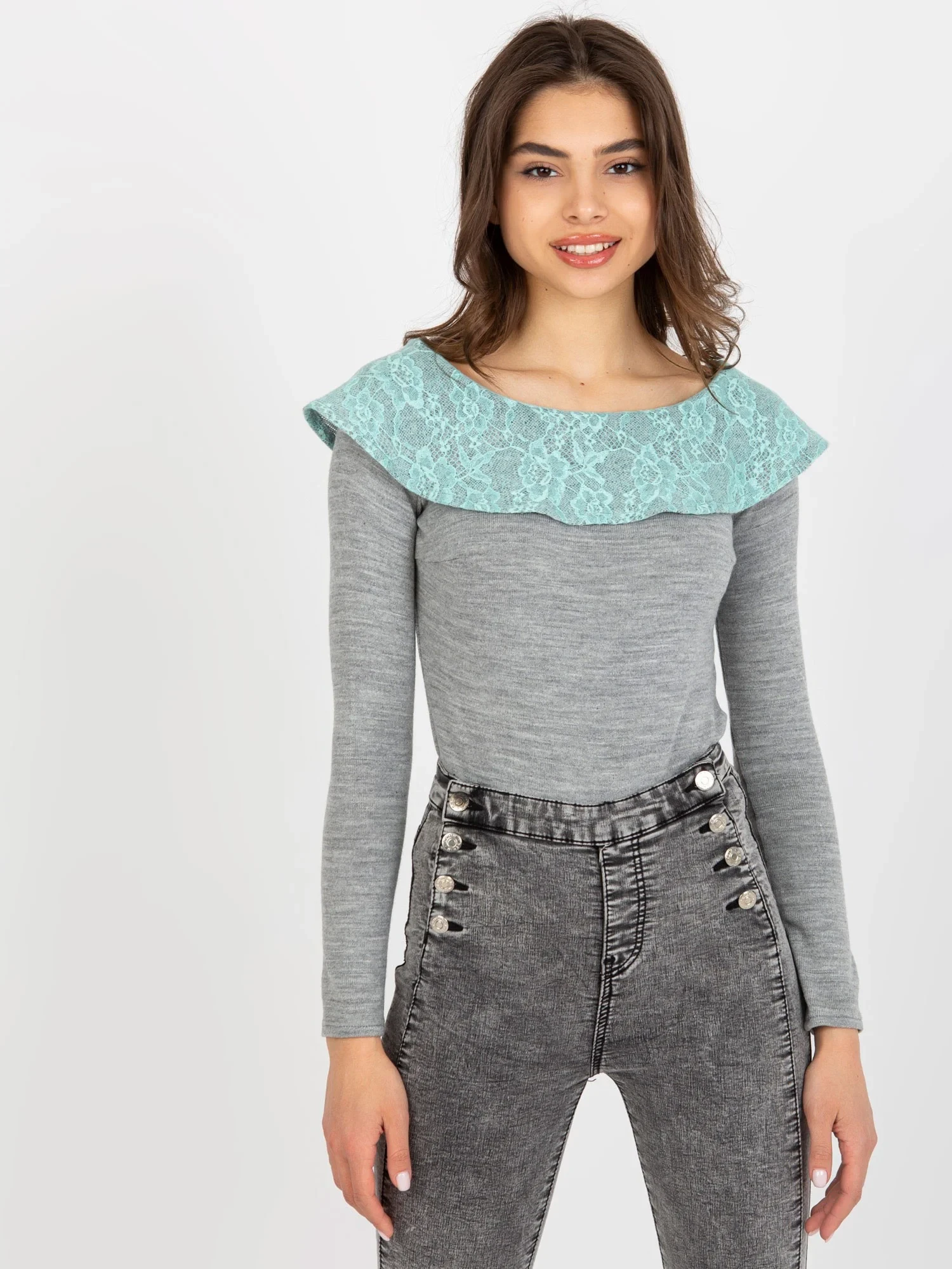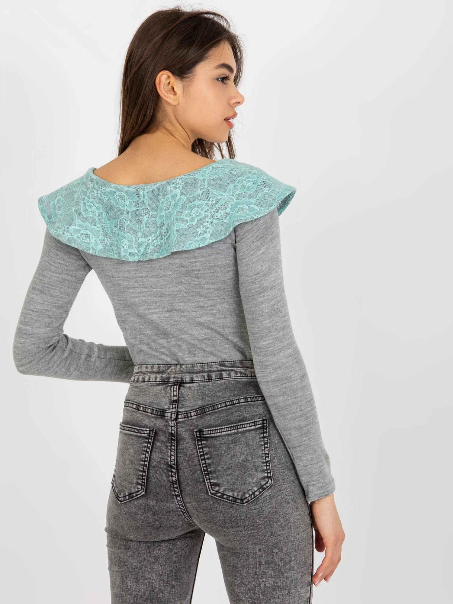 Dámská mátově šedá halenka s dlouhým rukávem a krajkou .