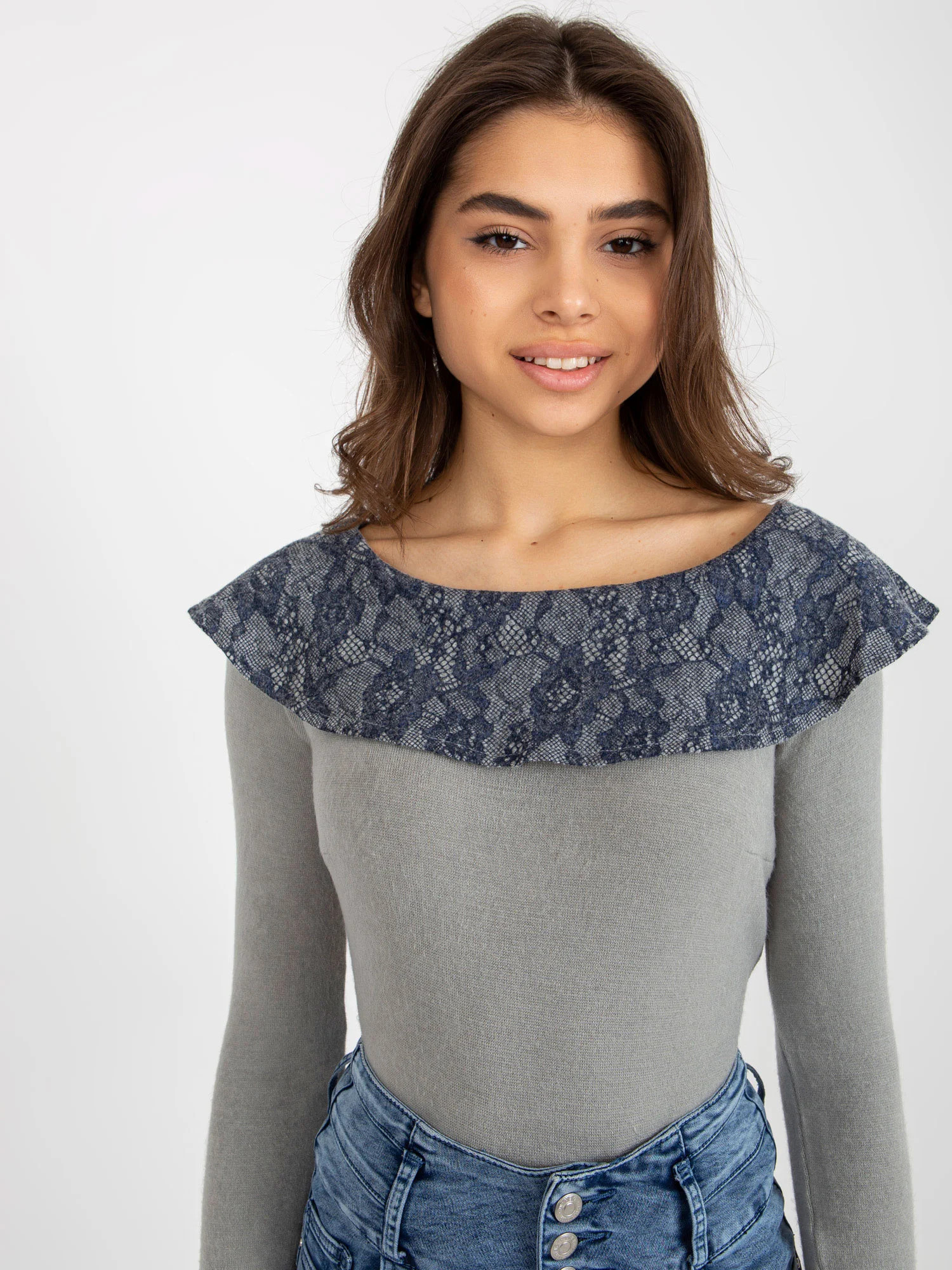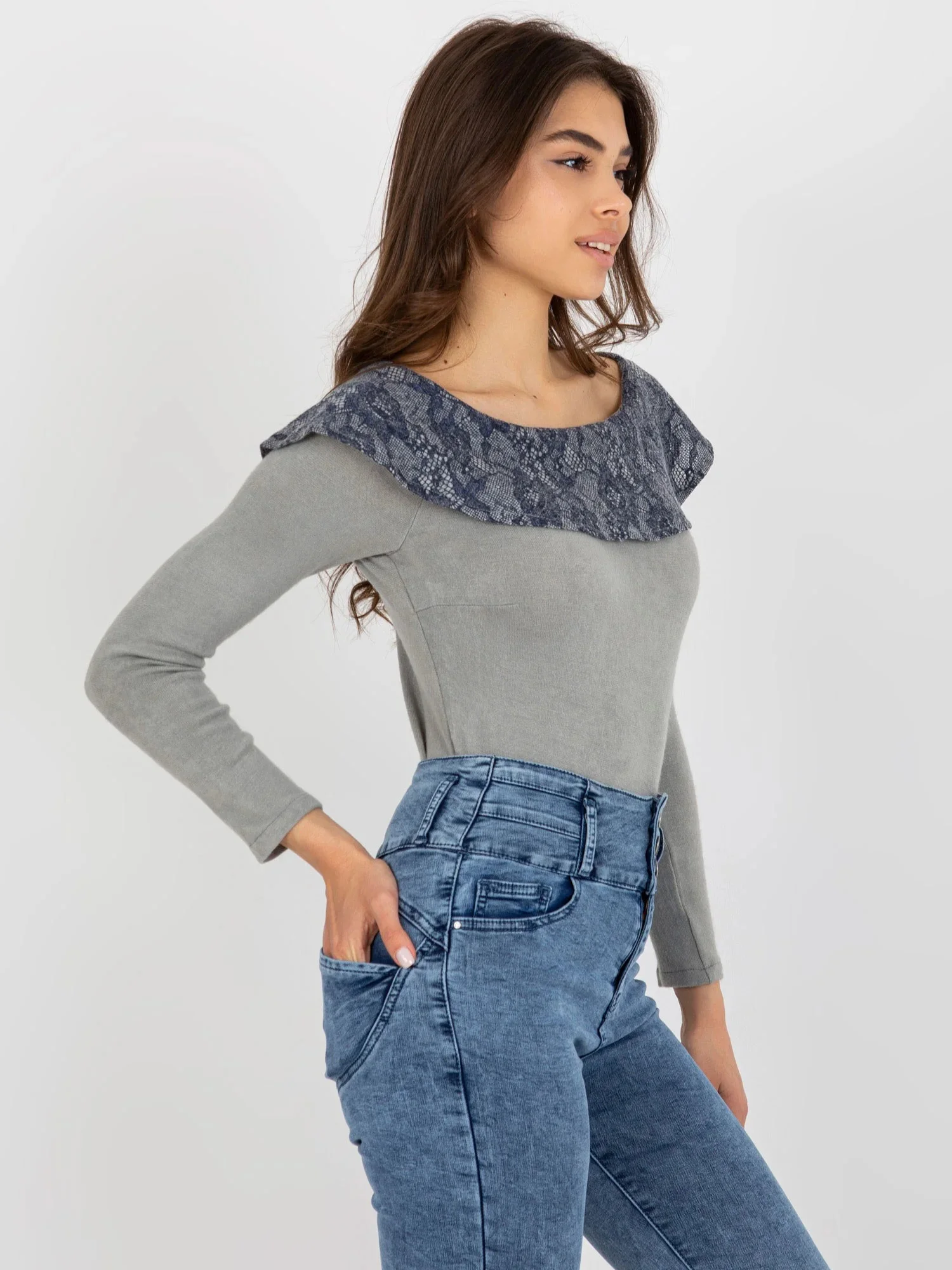 Szaro-granatowa bluzka z koronkowym dekoltem łódką.