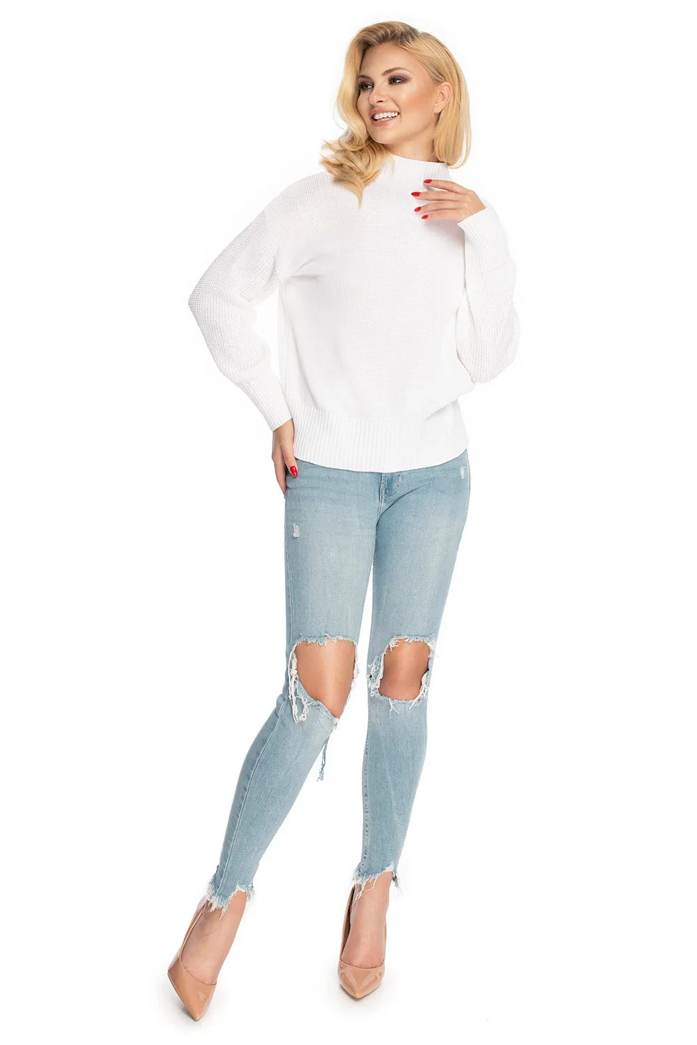 Volný svetr rovného střihu s dlouhými rukávy. Svetr je zakončen stojáčkem.