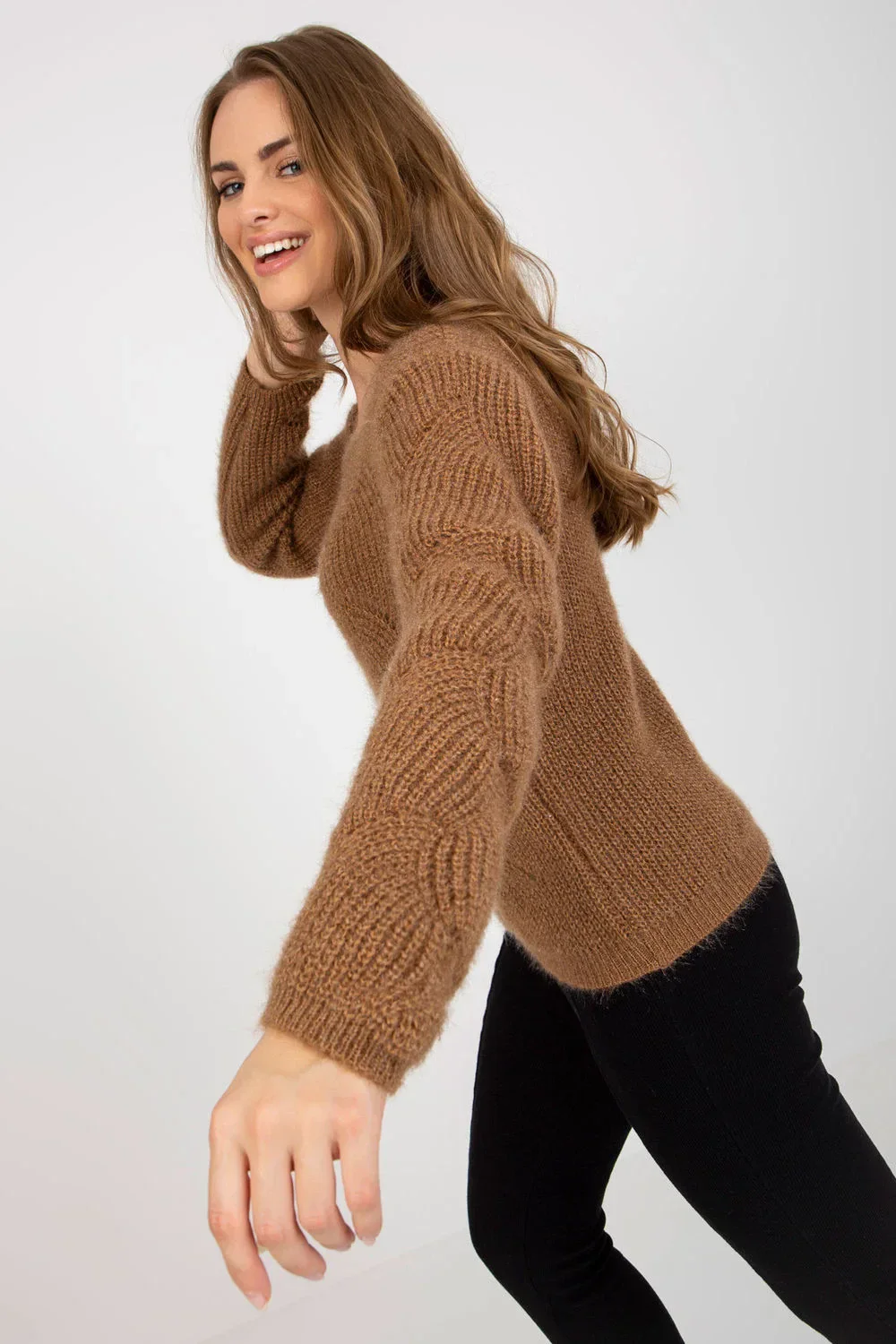 Ažurový svetr s dlouhými rukávy a lodičkovým výstřihem. Návrh pro mnoho příležitostí.