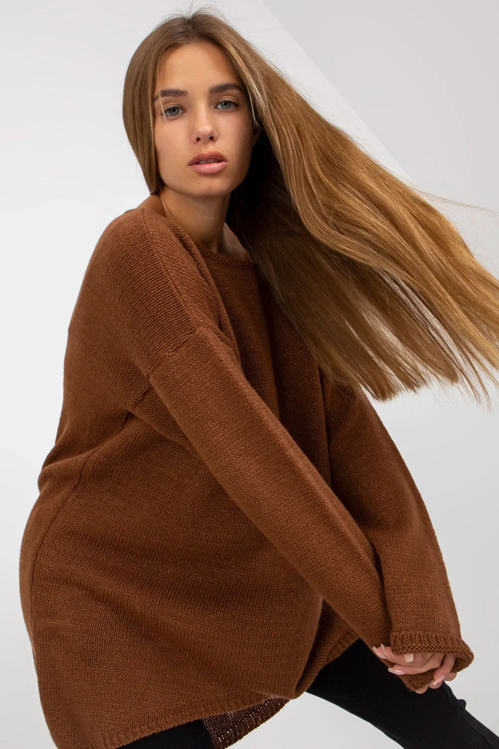 Dámský svetr s dlouhými rukávy a lodičkovým výstřihem. Na hřbetě rozříznutá ozdobná vazba.
