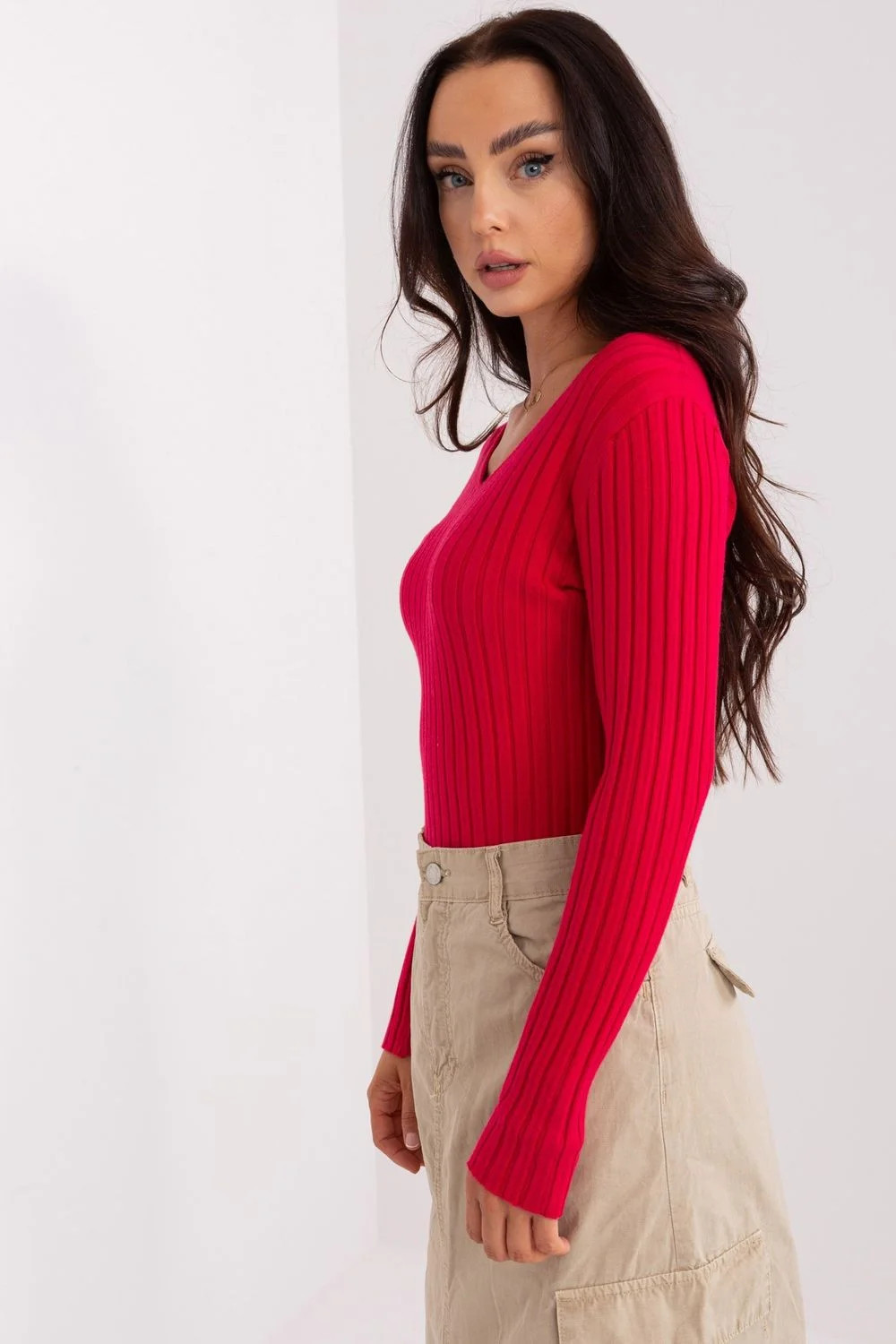 Tento žebrovaný dámský svetr je ideální volbou pro každodenní nošení. Je vyroben z příjemné viskózy, zaručuje pohodlné nošení a žebrovaný vzor mu dodává jemný nádech. Díky dlouhému rukávu je skvělou volbou pro chladnější dny. Díky ležérnímu stylu a hladkému vzoru je vhodný pro různé příležitosti. Standardní délka a výstřih do V mu dodávají univerzální charakter, který snadno sladíte s dalšími kousky ve svém šatníku. Tento svetr je ideální pro každodenní situace a dodá vašemu oblečení jedinečný nádech.