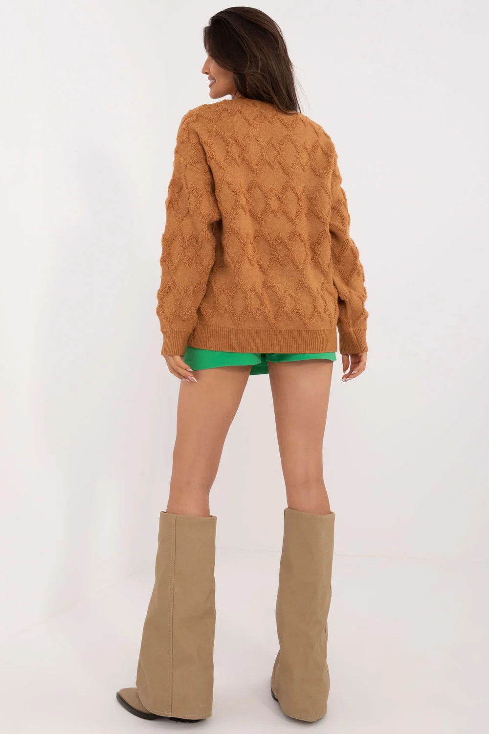 Dámský svetr v casual stylu, ideální na každodenní příležitosti. Vyznačuje se různorodou fakturou pletení, která mu dodává jemnou eleganci. Svetr má standardní délku a dlouhé rukávy, což zajišťuje pohodlí nošení po celý den. Kulatý výstřih zdůrazňuje klasický charakter modelu, který se skvěle hodí jak do práce, tak na volno.