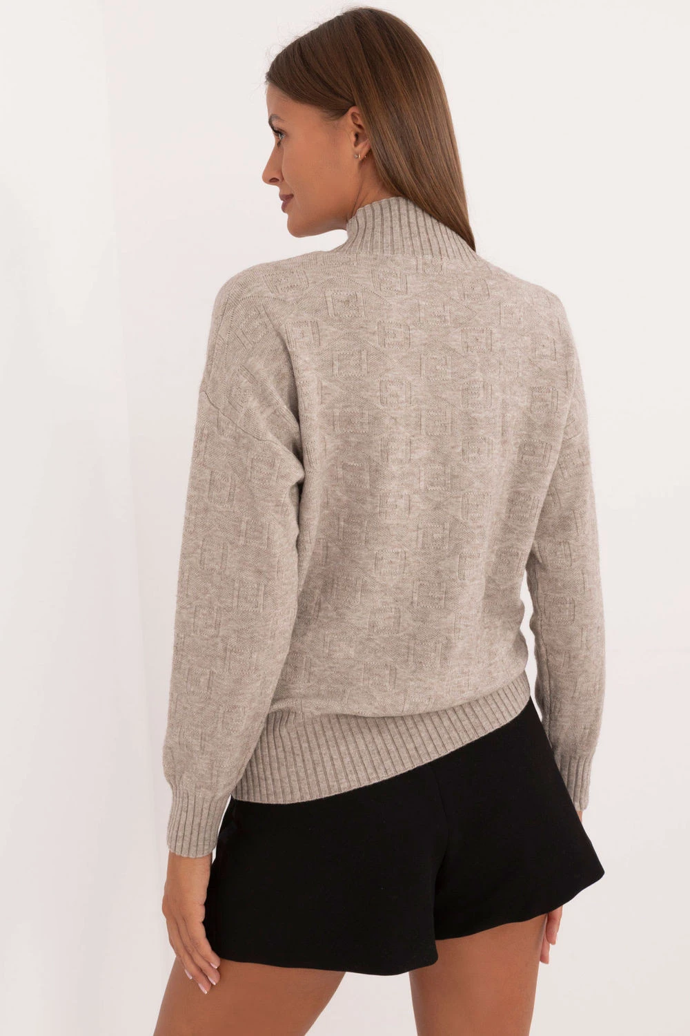 Ležérní svetr s polovičním rolákem, ideální pro každodenní nošení i do práce. Je vyroben ze směsi akrylu a polyesteru a zaručuje pohodlí a teplo. Různorodá textura tkaniny dodává svetru jedinečný nádech a odlišuje ho od klasických modelů. Svetr má standardní délku a dlouhé rukávy, takže je univerzální a ideální pro chladnější dny. Je skvělou volbou pro ženy, které ocení pohodlí v kombinaci s módním, ležérním stylem.