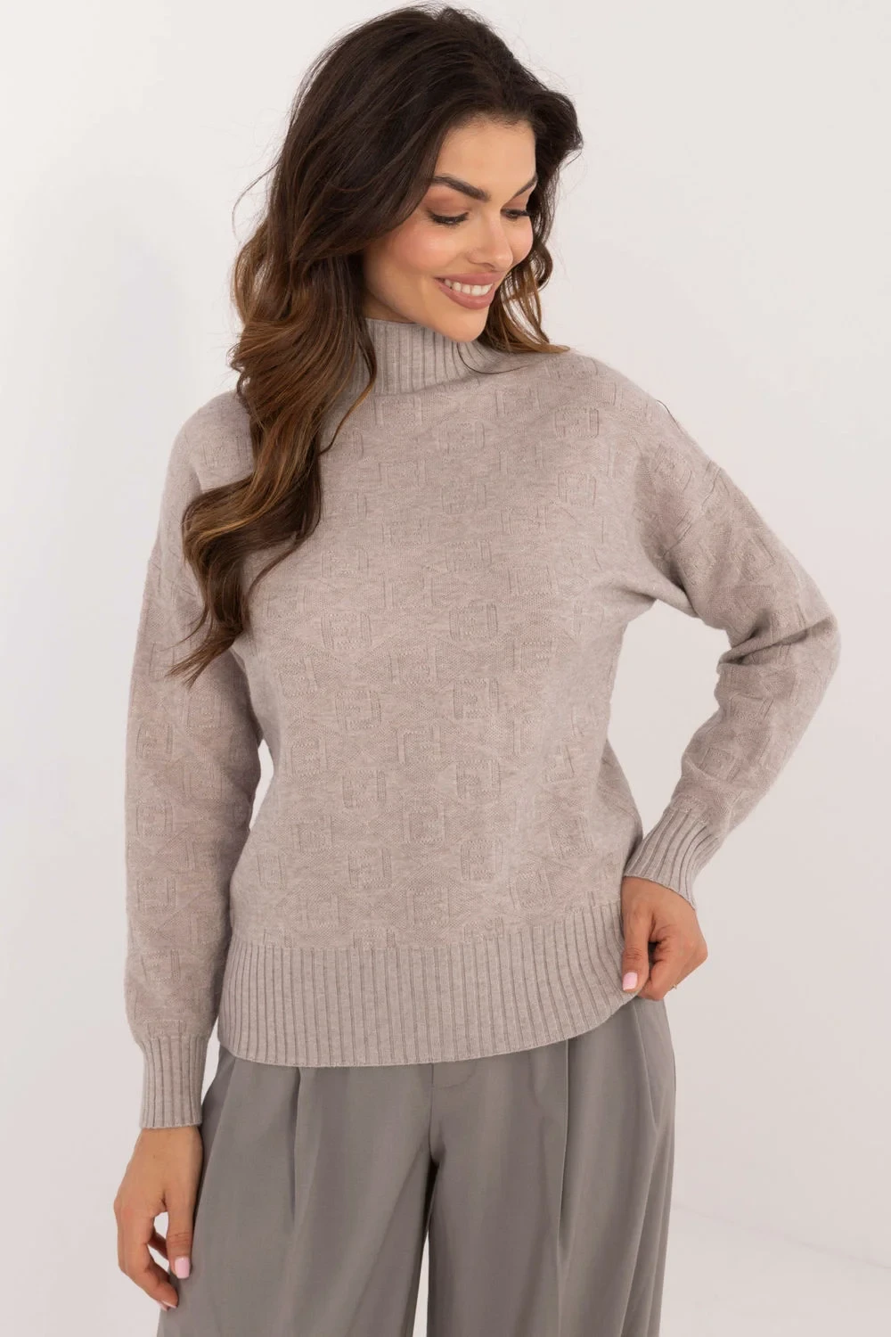 Ležérní svetr s polovičním rolákem, ideální pro každodenní nošení i do práce. Je vyroben ze směsi akrylu a polyesteru a zaručuje pohodlí a teplo. Různorodá textura tkaniny dodává svetru jedinečný nádech a odlišuje ho od klasických modelů. Svetr má standardní délku a dlouhé rukávy, takže je univerzální a ideální pro chladnější dny. Je skvělou volbou pro ženy, které ocení pohodlí v kombinaci s módním, ležérním stylem.