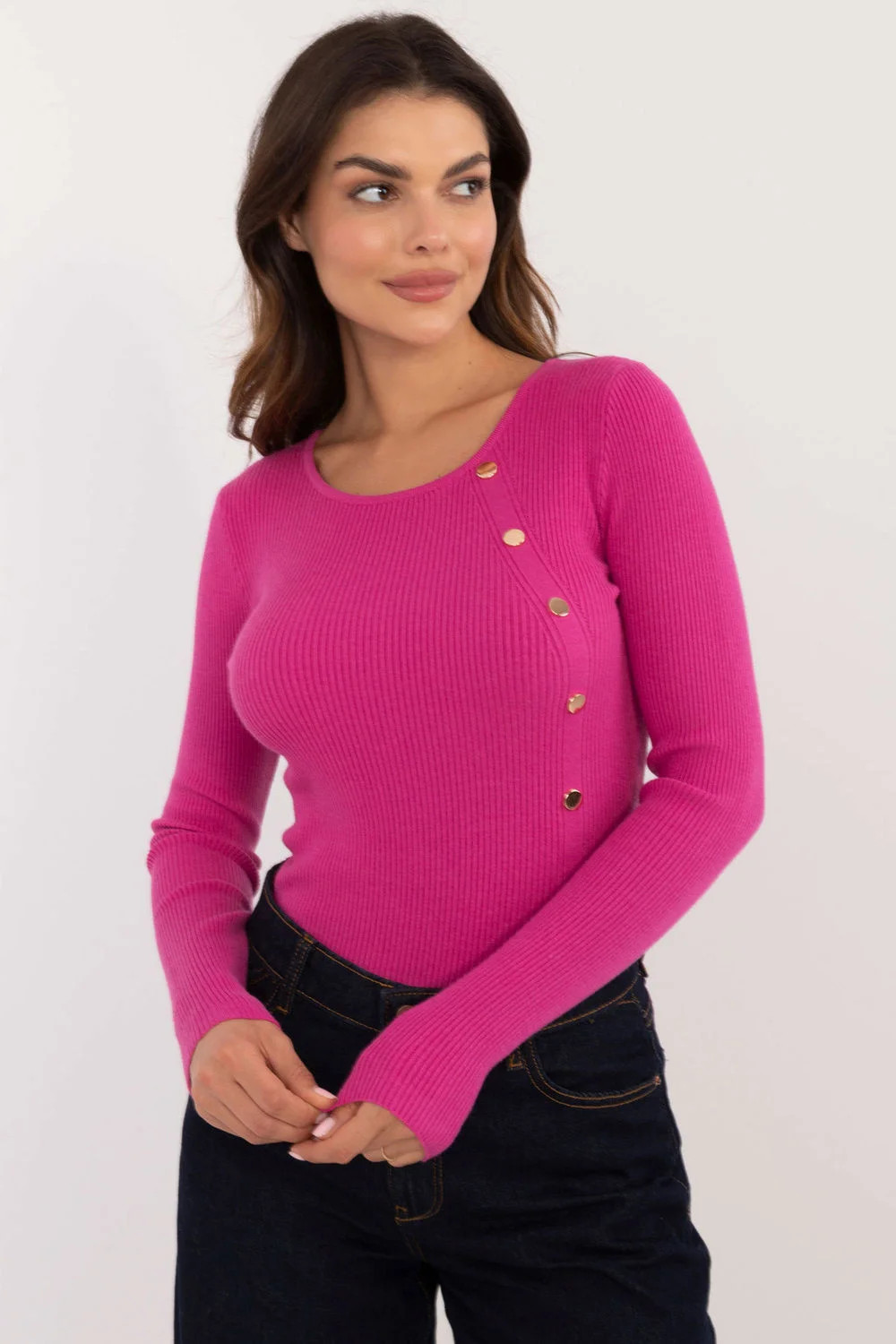Ležérní dámský svetr, ideální pro každodenní nošení i do práce. Je vyroben ze směsi viskózy, polyesteru a polyamidu a poskytuje pohodlí a odolnost. Hladká žebrovaná tkanina podtrhuje jemný, klasický charakter svetru, který má standardní délku a dlouhé rukávy. Kulatý výstřih dodává svetru univerzálnost, zatímco ozdobné knoflíky na přední straně, které se táhnou po celé délce svetru, mu dodávají stylový a elegantní nádech. Je to skvělá volba pro ležérní stylizaci, která kombinuje pohodlí s módním, ženským designem.