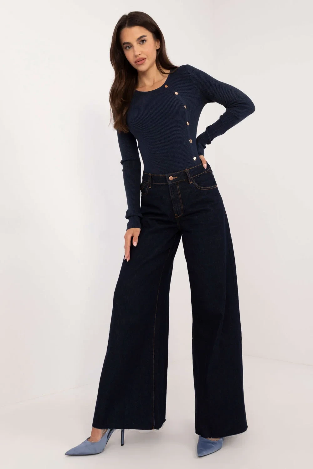 Ležérní dámský svetr, ideální pro každodenní nošení i do práce. Je vyroben ze směsi viskózy, polyesteru a polyamidu a poskytuje pohodlí a odolnost. Hladká žebrovaná tkanina podtrhuje jemný, klasický charakter svetru, který má standardní délku a dlouhé rukávy. Kulatý výstřih dodává svetru univerzálnost, zatímco ozdobné knoflíky na přední straně, které se táhnou po celé délce svetru, mu dodávají stylový a elegantní nádech. Je to skvělá volba pro ležérní stylizaci, která kombinuje pohodlí s módním, ženským designem.