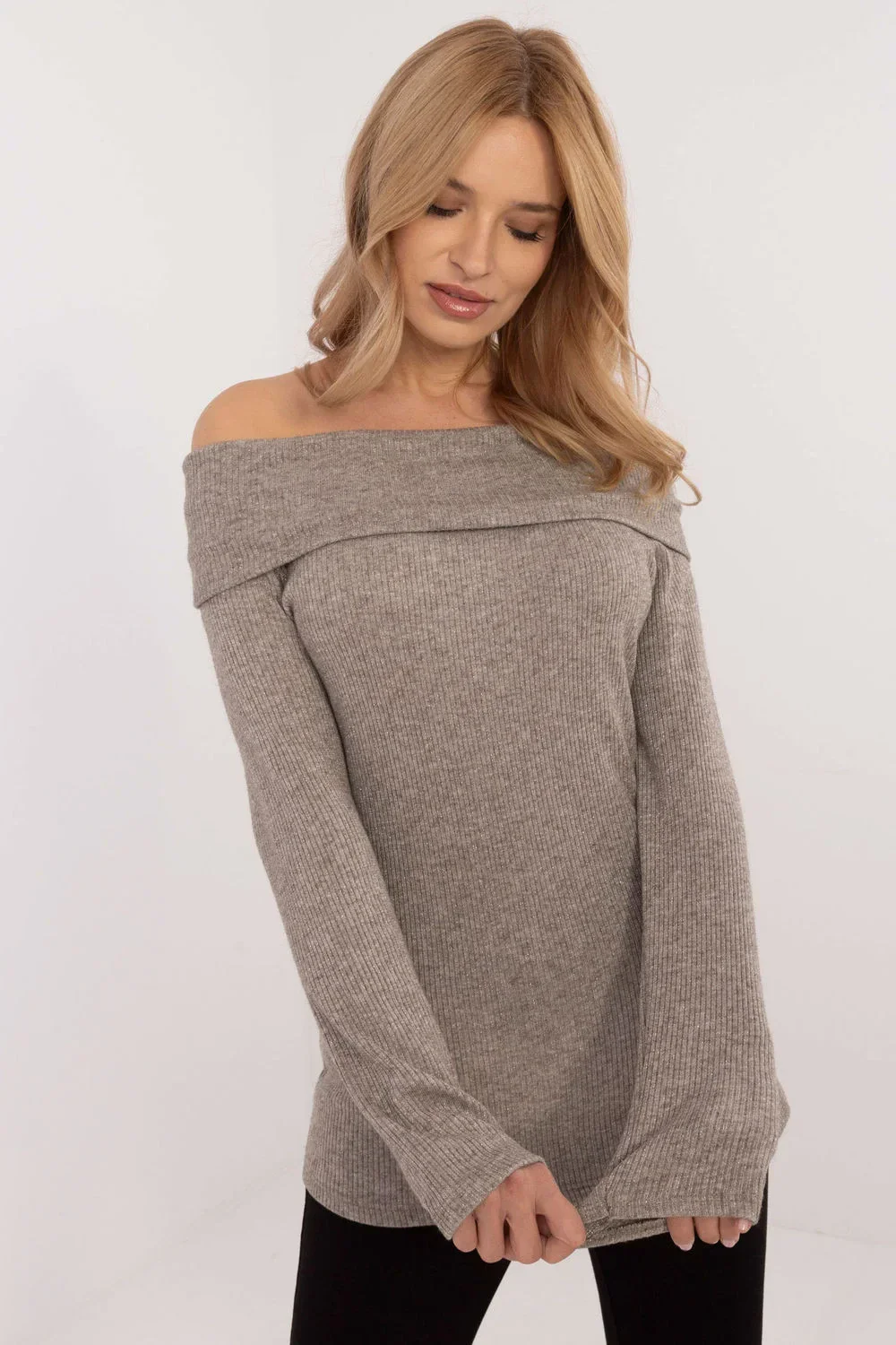 Elegantní dámský svetr, ideální jak do práce, tak na každý den. Vyrobený z vysoce kvalitní směsi viskózy a elastanu, zajistí pohodlí nošení a skvělé přizpůsobení. Svetr má pruhovanou, bohatou texturu materiálu, která mu dodává charakter a jemnou eleganci. Má dlouhý rukáv a španělský výstřih, který efektně zdůrazňuje ramena a dodává stylizaci ženskost. Navíc, lesklá nit na povrchu materiálu přidává celku jemný, elegantní lesk. To je skvělá volba pro ženy, které ocení pohodlí a eleganci ve svých každodenních stylizacích.