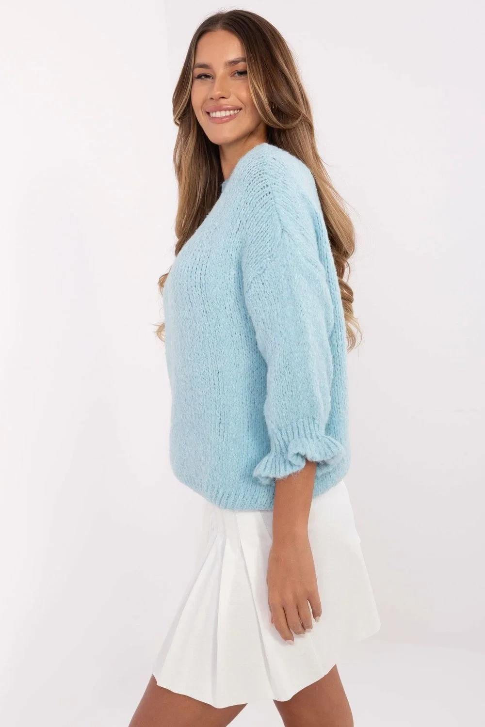 Stylový dámský svetr s casual charakterem, skvělý na každý den i do práce. Vyrobený z vysoce kvalitní směsi akrylu, vlny (lana), viskózy a polyamidu, je měkký, příjemný na dotek a pohodlný na nošení. Hladký vzor mu dodává elegantní jednoduchost a 3/4 rukávy zdobené decentním volánem mu dodávají ženského šarmu. Standardní délka se skvěle hodí jak k džínům, tak k formálnějším kalhotám nebo sukním. Ideální volba pro ženy, které ocení styl, pohodlí a nadčasovou eleganci.