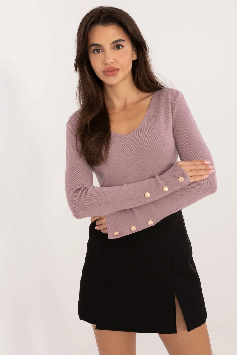 Dámský volný svetr ideální na každodenní nošení i do práce. Vyrobený z vysoké kvality směsi materiálů: viskózy, polyamidu a polyesteru, který zaručuje pohodlí a odolnost. Hladký vzor a klasická délka dělají z tohoto svetru univerzální kousek oblečení. Svetr má dlouhý rukáv zakončený ozdobnými knoflíčky na zápěstích, které dodávají jemný elegantní akcent. Výstřih ve tvaru písmene V zdůrazňuje krk a dodává celku ženský nádech. Skvělá volba jak do kanceláře, tak na každodenní nošení.