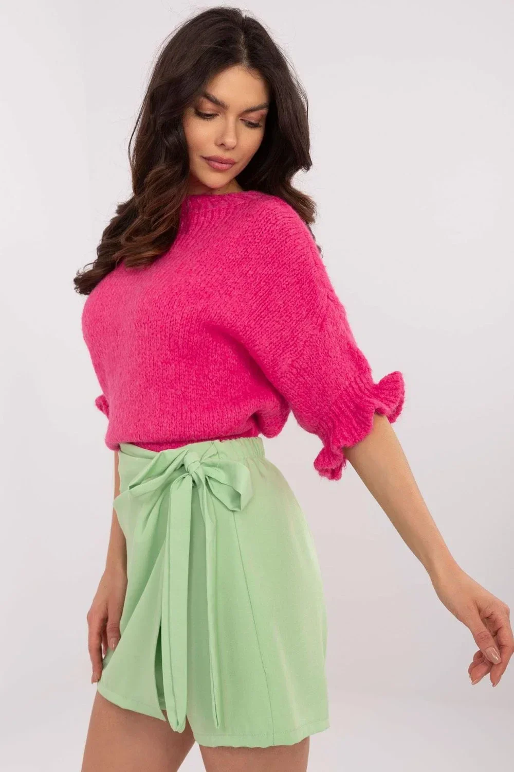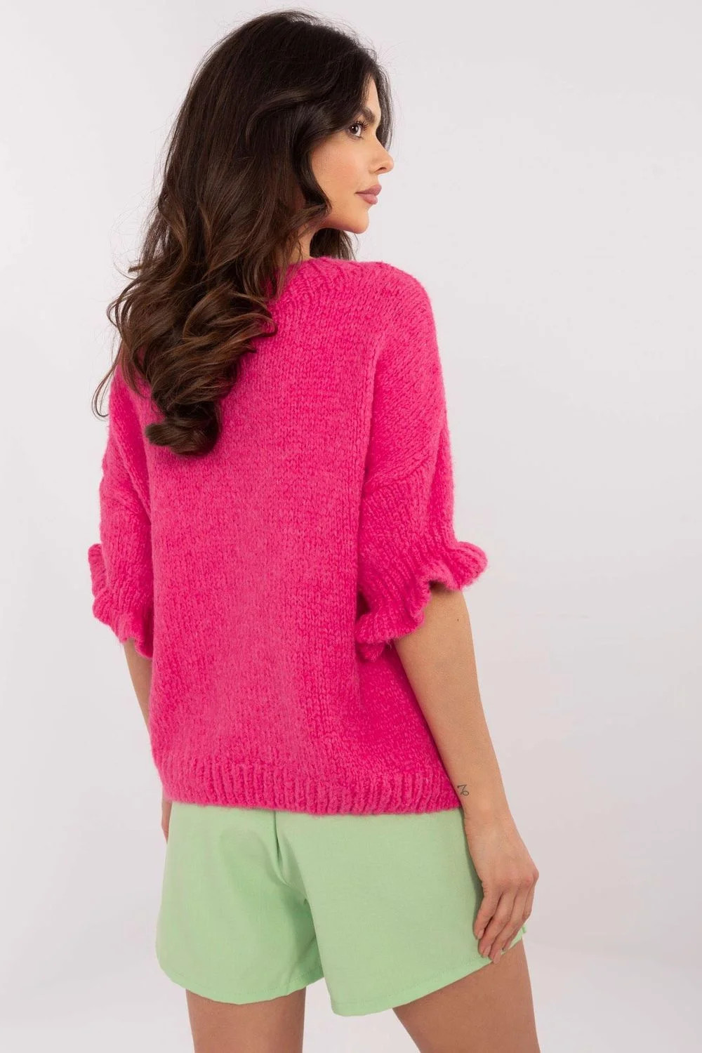 Elegantní dámský svetr s ležérním charakterem je skvělou volbou na každý den i do práce. Vyrobený z měkké směsi akrylu, vlny, polyamidu a viskózy, poskytuje teplo a pohodlí při nošení. Má klasickou standardní délku a elegantní kulatý výstřih, který jemně zdůrazňuje krk. Rukávy délky 3/4 zdobí jemné volány, které dodávají celku ženský šarm. Hladká faktura materiálu dělá svetr univerzálním a snadno kombinovatelným, ideální jak k elegantním kalhotám, tak ke každodenním džínům.