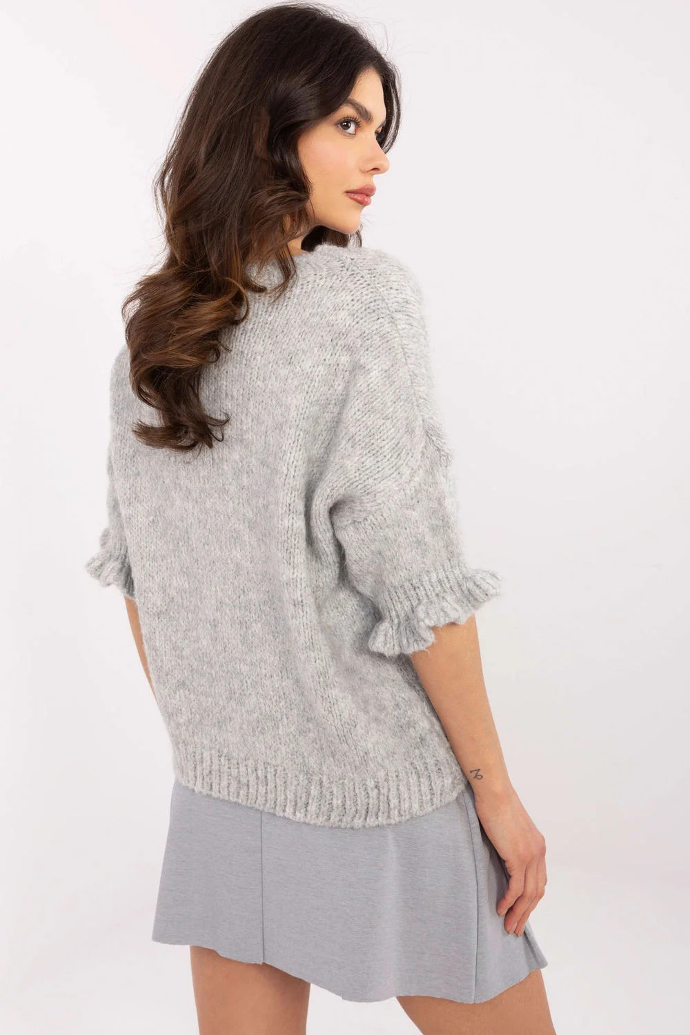 Elegantní dámský svetr s ležérním charakterem je skvělou volbou na každý den i do práce. Vyrobený z měkké směsi akrylu, vlny, polyamidu a viskózy poskytuje teplo a pohodlí při nošení. Má klasickou, standardní délku a elegantní kulatý výstřih, který jemně zdůrazňuje krk. Rukávy s délkou 3/4 zdobí jemné volánky, které dodávají celku ženský šarm. Hladká struktura materiálu dělá svetr univerzálním a snadno kombinovatelným, ideální jak k elegantním kalhotám, tak k běžným džínům.