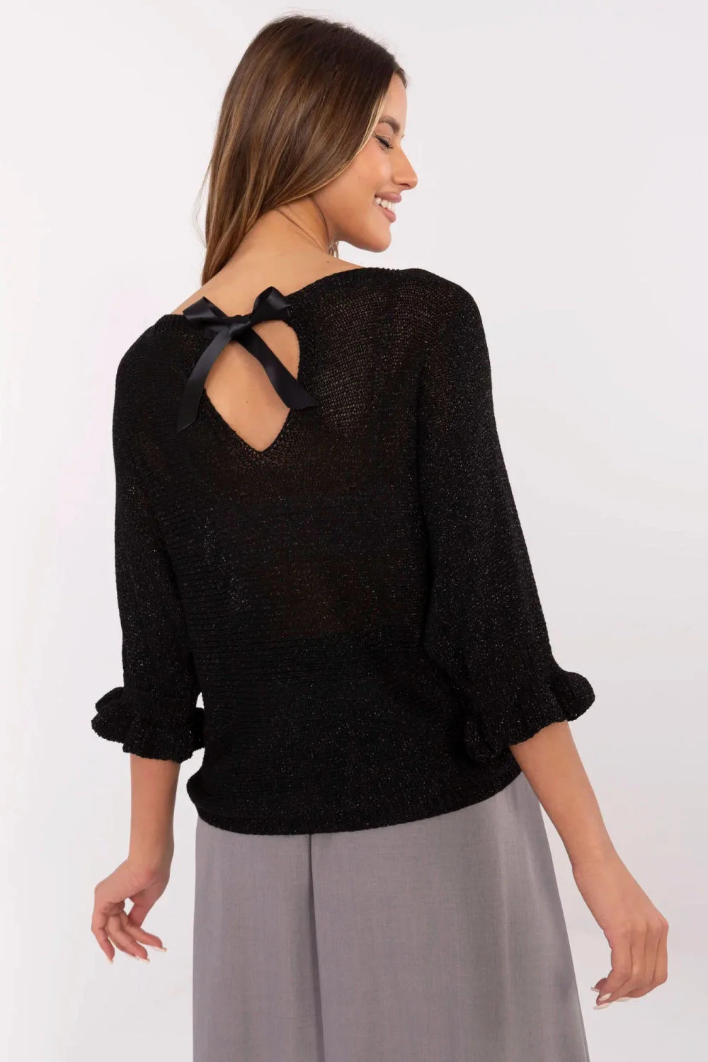 Elegantní dámský svetr je skvělou volbou na každou příležitost, ideální pro každodenní nošení i do práce. Vyrobený z vysoce kvalitní viskózy s přídavkem metalizovaného vlákna zajistí pohodlí nošení a decentní, stylový lesk. Hladký vzor podtrhuje klasický charakter modelu a 3/4 rukávy s mašlí dodávají ženský půvab. Kulatý výstřih krásně zdůrazňuje krk, zatímco vázání vzadu ve formě mašle je elegantní, efektní akcent. Svetr s standardní délkou je kombinací pohodlí a elegantního vzhledu, který doplní každý outfit.