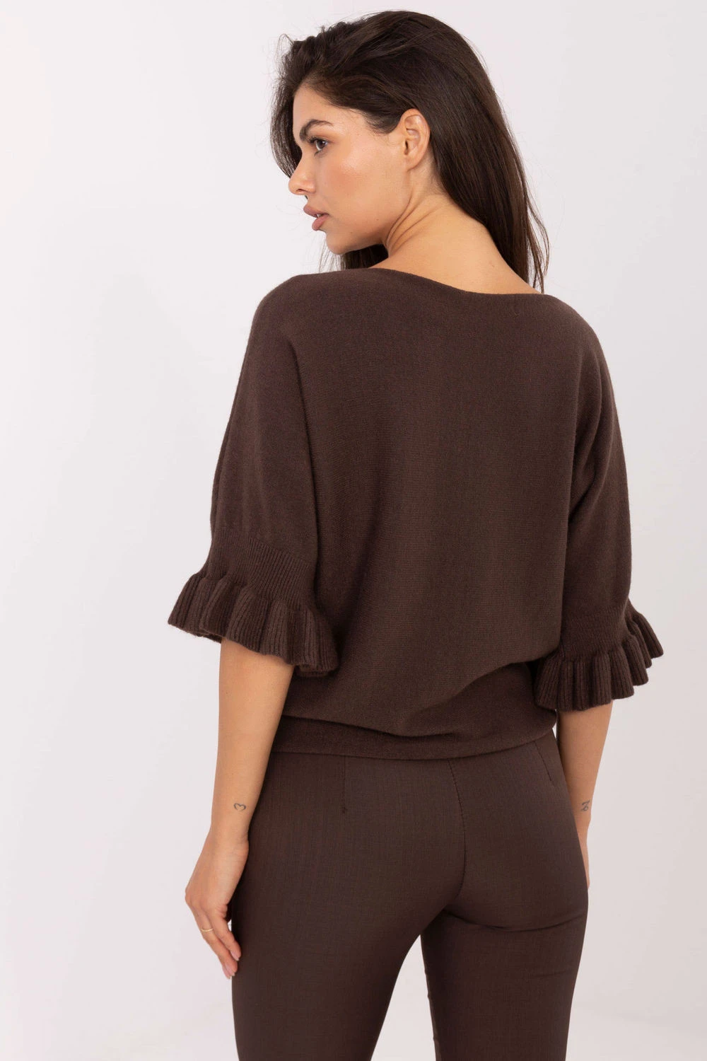 Elegantní dámský svetr standardní délky, ideální jak na každý den, tak na speciální příležitosti. Vyrobený z vysoce kvalitní směsi viskózy, polyesteru a nylonu, poskytuje pohodlí a odolnost. Hladký vzor mu dodává nadčasový charakter a jemné detaily přidávají ženský šarm. Model se vyznačuje kulatým výstřihem a 3/4 rukávy zakončené jemným volánem, které zdůrazňují eleganci a lehkost stylizace. Skvělá volba pro ženy, které ocení klasiku v moderním provedení.