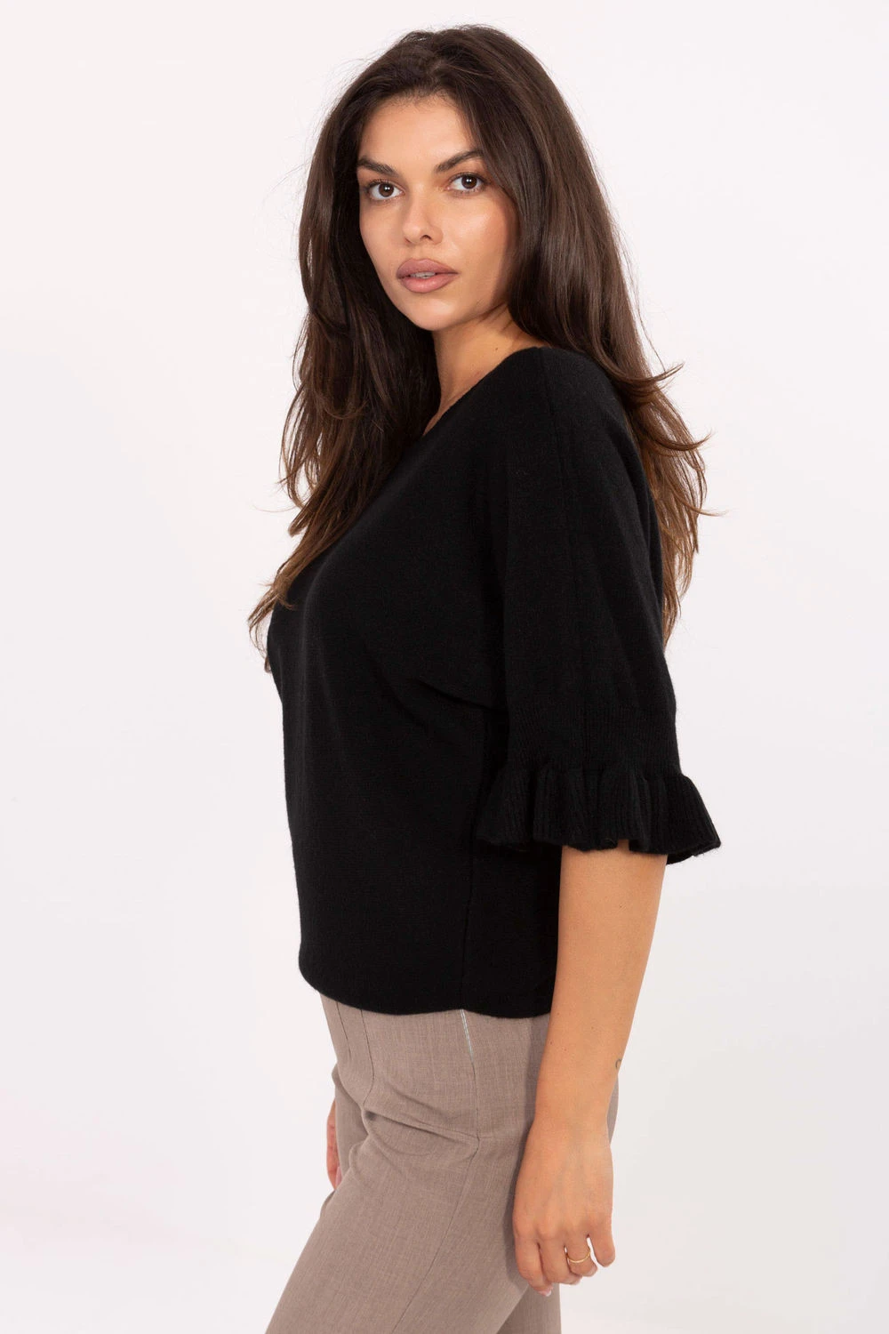 Elegantní dámský svetr standardní délky, ideální jak na každý den, tak i na speciální příležitosti. Vyrobený z vysoce kvalitní směsi viskózy, polyesteru a nylonu, poskytuje pohodlí nošení a trvanlivost. Hladký vzor mu dodává nadčasový charakter a decentní detaily přidávají ženský šarm. Model se vyznačuje kulatým výstřihem a 3/4 rukávy zakončenými jemným volánem, které zdůrazňují eleganci a lehkost stylizace. Skvělá volba pro ženy, které ocení klasiku v moderním provedení.