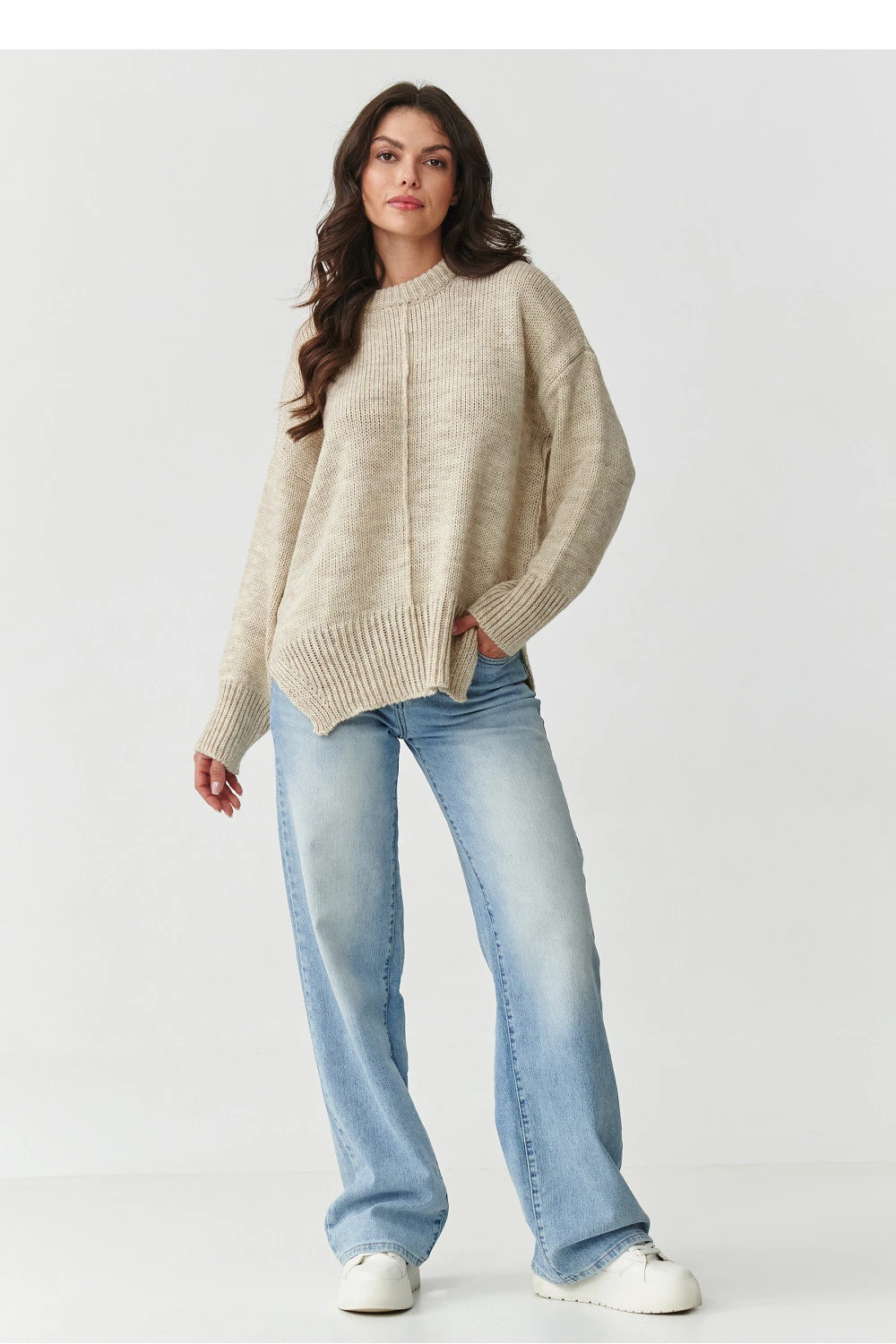 Tento dámský svetr je kombinací pohodlí, stylu a univerzálnosti, která vás zamiluje od prvního obléknutí. Jeho volný střih a moderní zpracování s jemnými švy uprostřed mu dodávají moderní charakter a zároveň se hodí ke každé postavě. Široké lemování u manžet a spodního lem svetříku zajišťuje, že se vše skvěle usadí a udrží si svůj tvar i po mnoha praních. Dodávají mu také charakter a nádech ležérní elegance. Vyrobený z měkkého akrylu vás zahřeje v chladných dnech, zůstává však lehký a mimořádně příjemný na dotek. K dispozici v nadčasových barvách: béžové melíry, cappuccino, grafitové melíry a šedé melíry se skvěle začlení do vašeho šatníku a bude základem pro mnoho stylizací. Oblékněte si ho k oblíbeným džínům na každý den, spojte s elegantními kalhotami do práce nebo si ho přehoďte přes ramena v chladný večer, vždy budete vypadat stylově a cítit se pohodlně. Tento dámský svetr spojuje jednoduchost a eleganci se subtilními detaily, které udělají rozdíl. Pokud hledáte model, který vám poslouží na mnoho let, tento akrylový svetr bude vaší spolehlivou volbou.