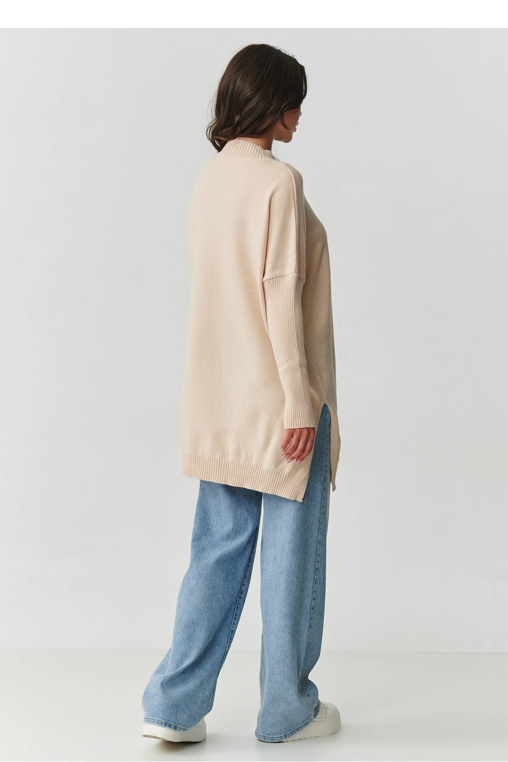 Sveter oversized pro dámy s převahou viskózy je ztělesněním pohodlí a ženské elegance v každodenním provedení. Měkký, jemný materiál objímá tělo jako druhá kůže, poskytující pohodlí po celý den bez ohledu na příležitost. Díky oversized střihu a jemným rozparkům po stranách se svetr krásně usazuje na postavě, dodávající jí lehkost a volnost. Výstřih nejen zdůrazňuje krk, ale také dodává celku moderní a rafinovaný charakter. Jedná se o ideální nabídku pro ženy, které si cení spojení jednoduchosti a stylu, skvěle ladí jak s džínami, tak s elegantními kalhotami nebo legíny. Tento model se stane tvým oblíbeným společníkem v chladnějších dnech, obklopujícím tě jemností a subtilní elegancí.