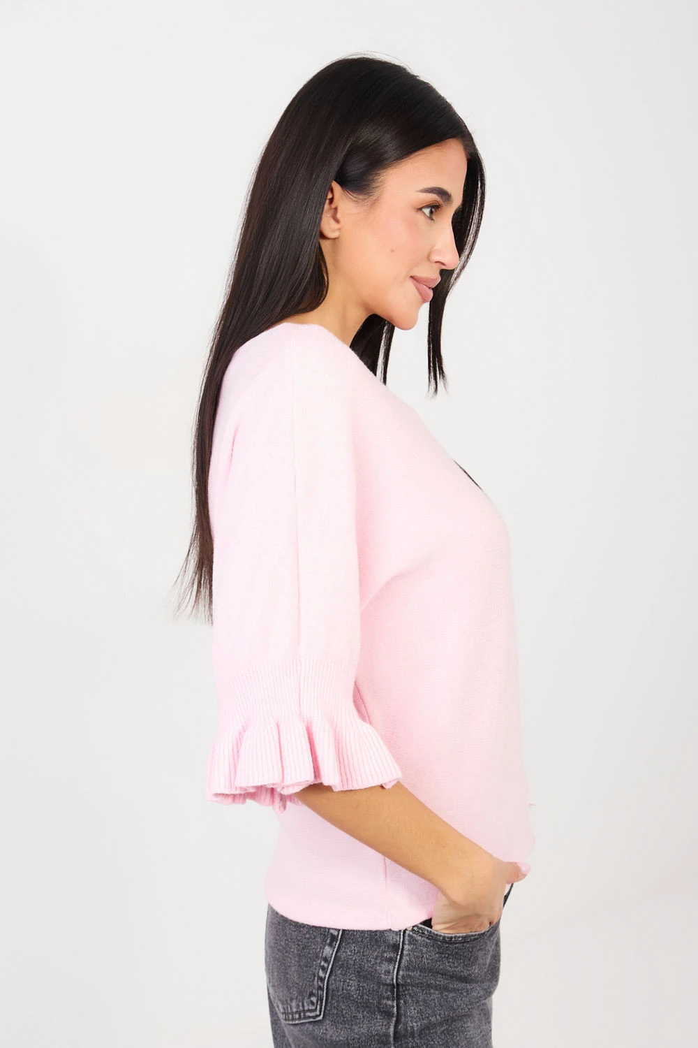 Elegantní dámský svetr standardní délky, ideální jak na každý den, tak i na speciální příležitosti. Vyrobený z vysoce kvalitní směsi viskózy, polyesteru a nylonu, poskytuje pohodlí a odolnost. Hladký vzor mu dodává nadčasový charakter a jemné detaily přidávají ženské kouzlo. Model se vyznačuje kulatým výstřihem a 3/4 rukávy zakončenými jemnou volánkou, které zdůrazňují eleganci a lehkost stylizace. Skvělá volba pro ženy, které oceňují klasiku v moderním provedení.