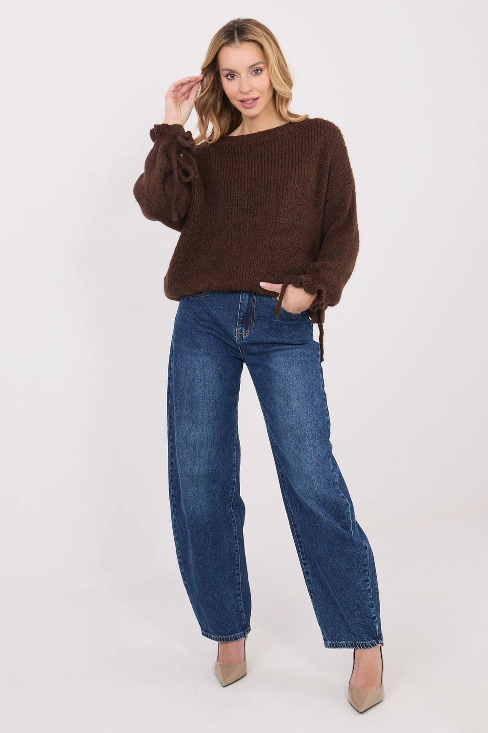 Dámský svetr s casualovým charakterem, ideální pro každodenní stýl a do práce. Model standardní délky, vyrobený z měkké a příjemné směsi akrylu, polyamidu, viskózy a vlny, která poskytuje pohodlí a teplo. Hladký vzor dává svetru univerzální vzhled, díky čemuž je snadné ho sladit s různými kousky oblečení. Klasický, kulatý výstřih a dlouhé rukávy zdůrazňují nadčasový střih. Dekorativní volánky s mašlí na rukávech dodávají celku ženskou přitažlivost a jemnou originalitu. Svetr nemá zapínání, co zajišťuje pohodlí a volnost nošení.
