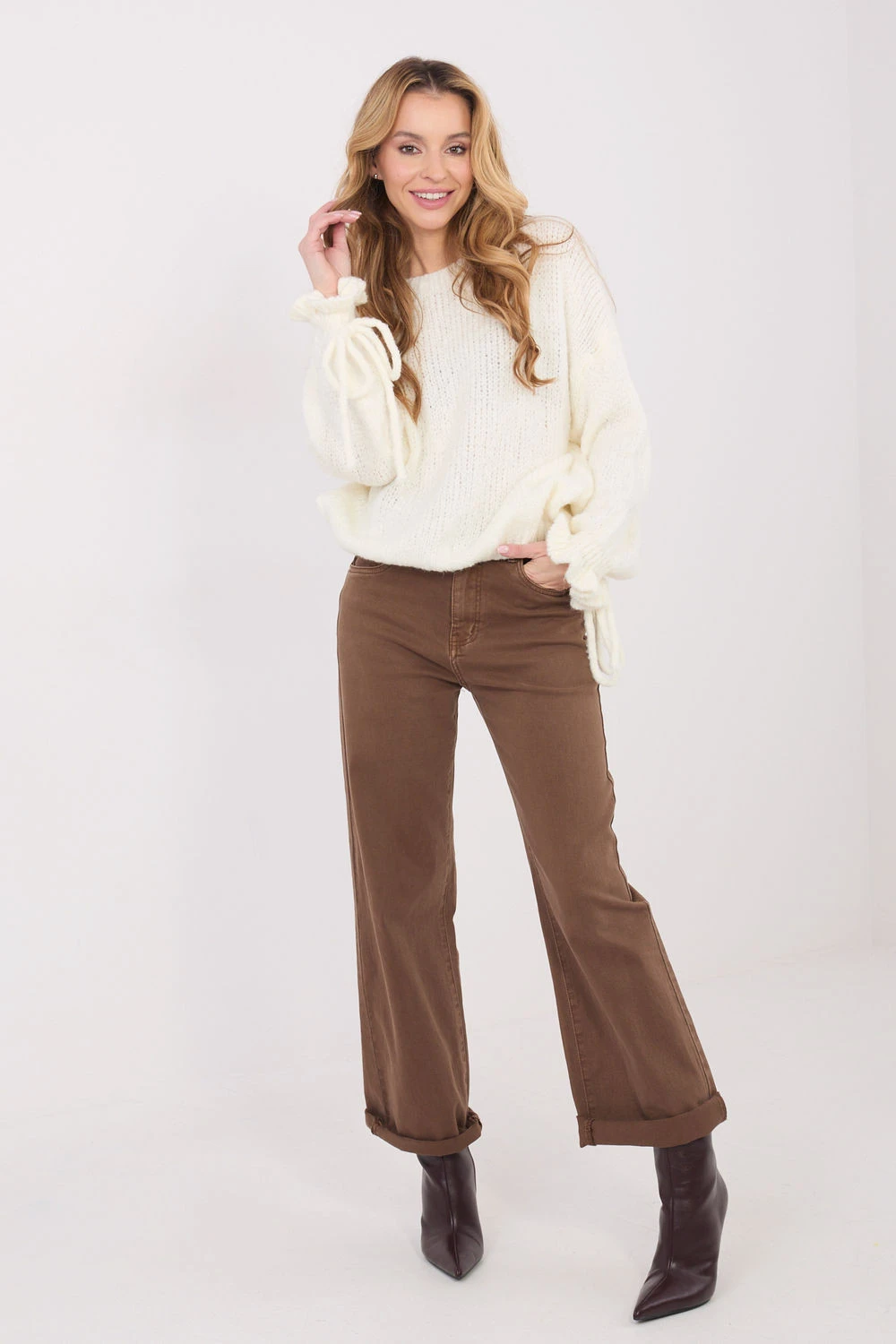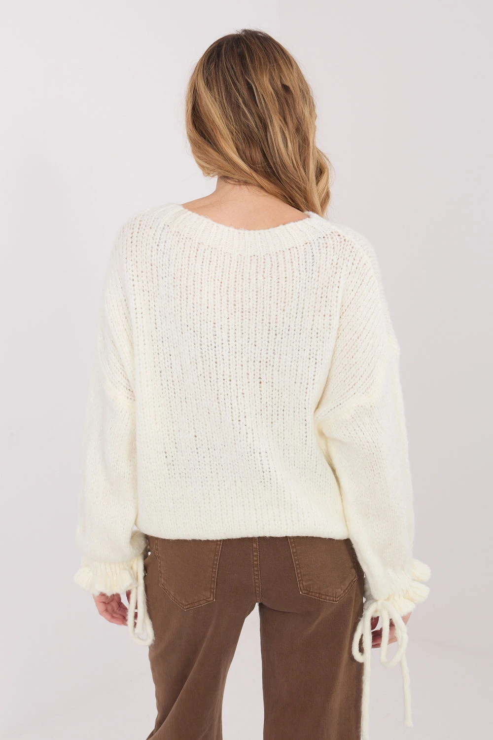 Dámský svetr s casual charakterem, ideální pro každodenní stylizace a práci. Model standardní délky, vyrobený z měkké a příjemné směsi akrylu, polyamidu, viskózy a vlny, která zajišťuje pohodlí a teplo. Hladký vzor dodává svetru univerzální vzhled, díky čemuž je snadné ho sladit s různými kousky oblečení. Klasický kulatý výstřih a dlouhé rukávy zdůrazňují nadčasový střih. Ozdobné volány s vázáním u rukávů dodávají celku ženský šarm a jemnou originalitu. Svetr nemá zapínání, co zajišťuje pohodlí a volnost nošení.