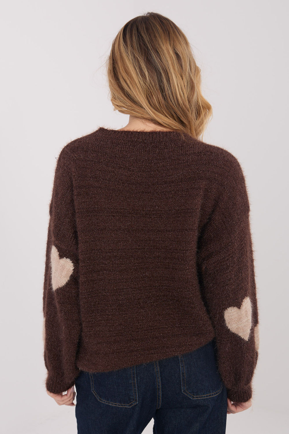 Dámský svetr s casual charakterem, navržený pro každodenní, pohodlné stylizace. Model je vyroben z měkké a teplé směsi akrylu, moheru a vlny, která poskytuje příjemný pocit i v chladnějších dnech. Svetr se vyznačuje efektním potiskem ve tvaru srdce, který mu dodává ženský a módní charakter. Standardní délka, klasický kulatý výstřih a dlouhé rukávy zaručují pohodlí a univerzálnost. Nadýchané rukávy jsou stylovým doplňkem, který celkovému vzhledu dodává lehkost a originalitu. Svetr se skvěle hodí do každodenních outfitů s džínami nebo sukní.