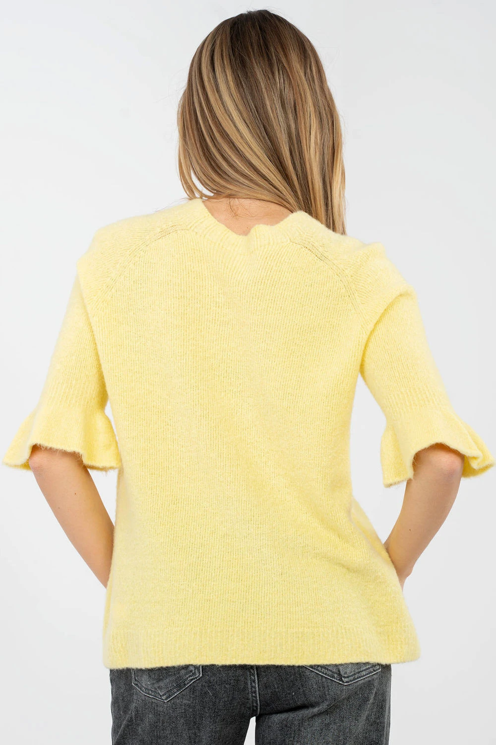 Casual dámský svetr je stylový a pohodlný návrh na každý den i do práce. Vyrobený z příjemné směsi akrylu, polyamidu a jemné baby alpaky poskytuje pohodlí nošení, jemnost a estetický vzhled. Model standardní délky s kulatým výstřihem vypadá klasicky a univerzálně. Krátký rukáv s efektní volánkou dodává svetru ženský půvab a jemnou eleganci. Hladký vzor umožňuje snadné sladění modelu s mnoha stylizacemi, ať už s elegantními kalhotami nebo sukní do práce, nebo s džíny na každý den. Svetr nemá zapínání, co zdůrazňuje jeho minimalistický charakter.
