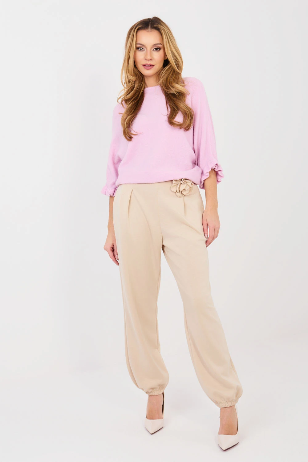 Elegantní dámský svetr v casualovém provedení, ideální na každý den i do práce. Model s hladkým vzorem, který skvěle zapadá do klasických a univerzálních stylizací. Vyrobený z vysoce kvalitní směsi akrylu, viskózy, polyamidu a alpaky, poskytuje pohodlí nošení, měkkost a příjemné teplo. Standardní délka dělá svetr skvěle sladitelným jak s kalhotami, tak s sukní. Rukávy délky 3/4 zakončené decentním volánem dodávají celku ženský charakter a lehkost. Výstřih ve tvaru lodičky elegantně zdůrazňuje linii ramen.