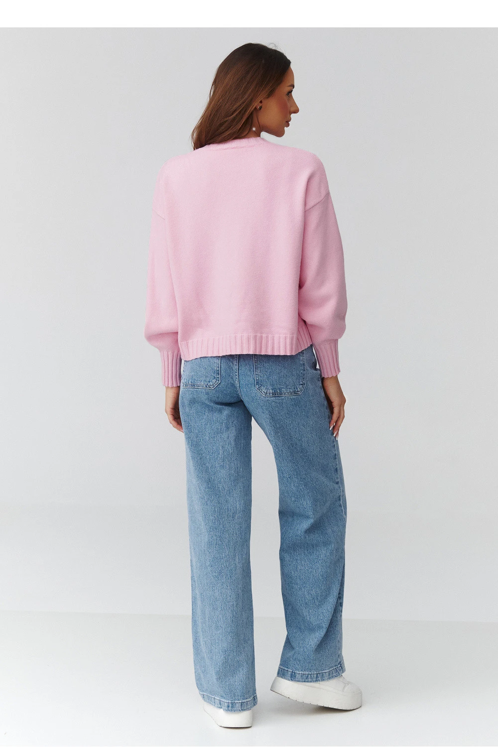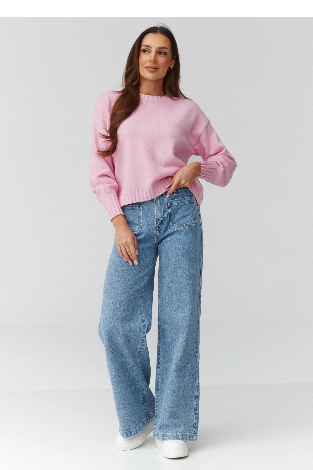 Elegantní a nadčasový dámský svetr v univerzálním velikostním provedení, který spojuje pohodlí s módním, ležérním stylem. Model s volným střihem oversize se skvěle hodí k různým postavám a poskytuje pohodlí po celý den. Svetr je vyroben z měkké, příjemné na dotek pleteniny, která jemně obklopuje tělo a bude vhodná jak na chladnější dny, tak na přechodné období. Klasický kulatý výstřih a manžety na rukávech a dole dodávají celku estetický, upravený vzhled. Jemné barvy skvěle zapadají do aktuálních trendů. Vyrobeno v Itálii.