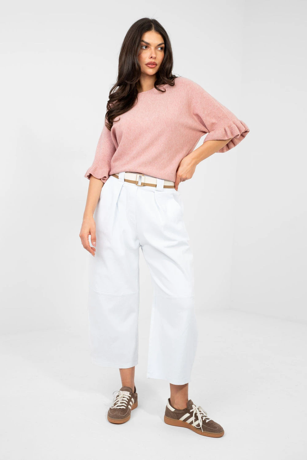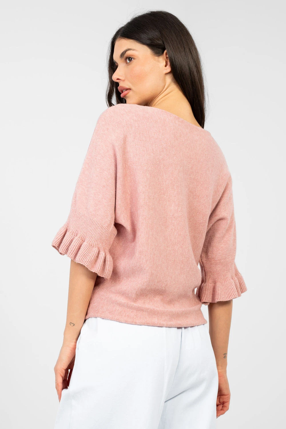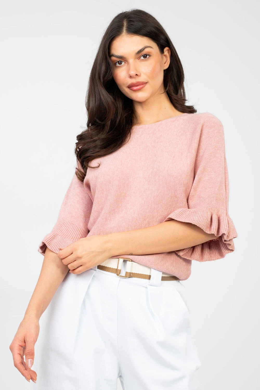 Elegantní dámský svetr standardní délky, ideální jak na každodenní nošení, tak na speciální příležitosti. Vyrobený z vysoké kvality směsi viskózy, polyesteru a nylonu, poskytuje pohodlí a odolnost. Hladký vzor mu dodává nadčasový charakter a decentní detaily přidávají ženské kouzlo. Model se vyznačuje kulatým výstřihem a 3/4 rukávy zakončenými jemnou volánem, které zdůrazňují eleganci a lehkost stylizace. Skvělá volba pro ženy, které si cení klasiky v moderním provedení.