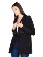 Elegantní dámský svetr bez knoflíků s vycpaným límcem. Rukávy jsou zakončeny kontrastní barvou. Kapsy na bocích. Svetr je zakončen kontrastním lemováním.