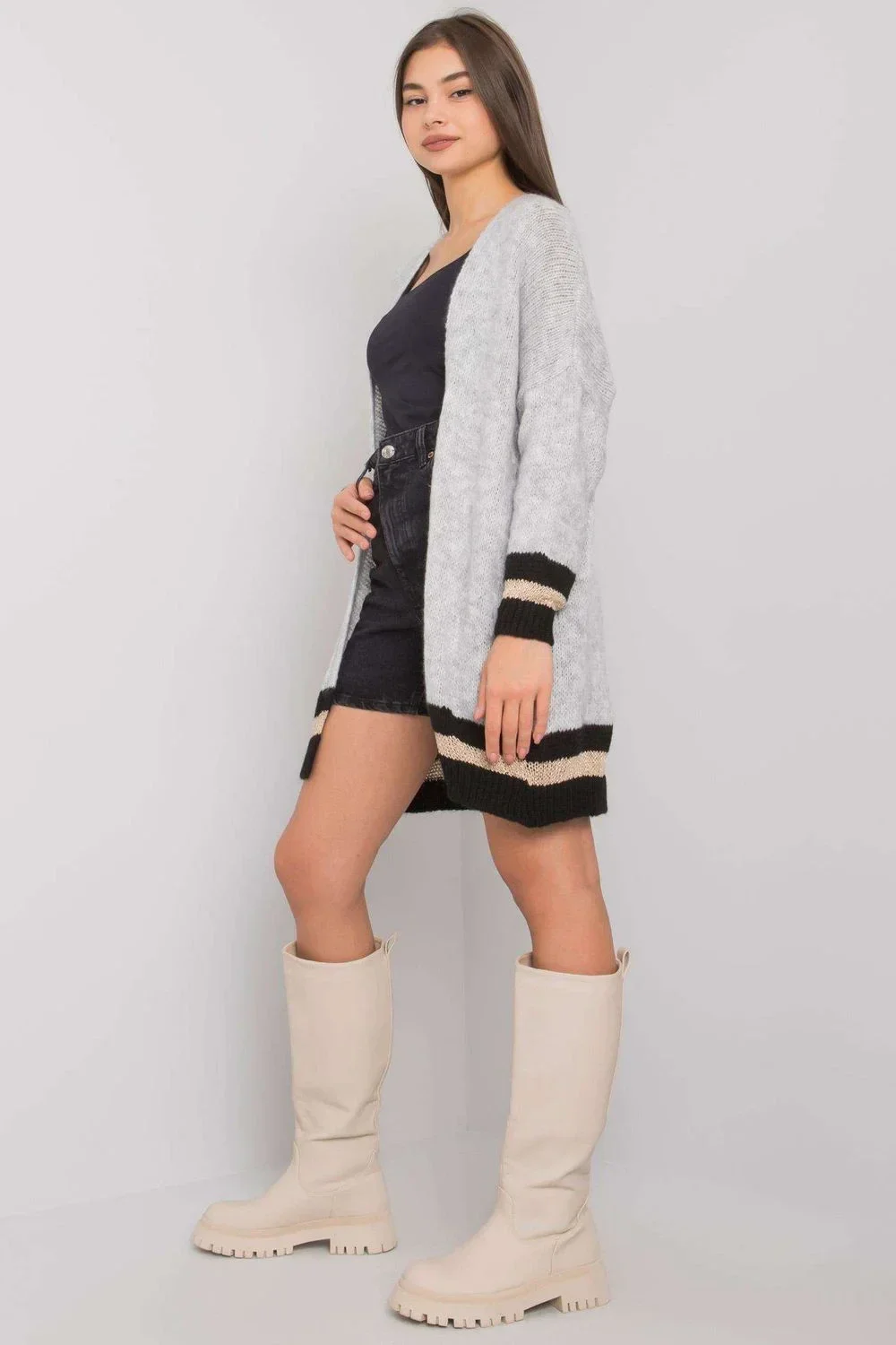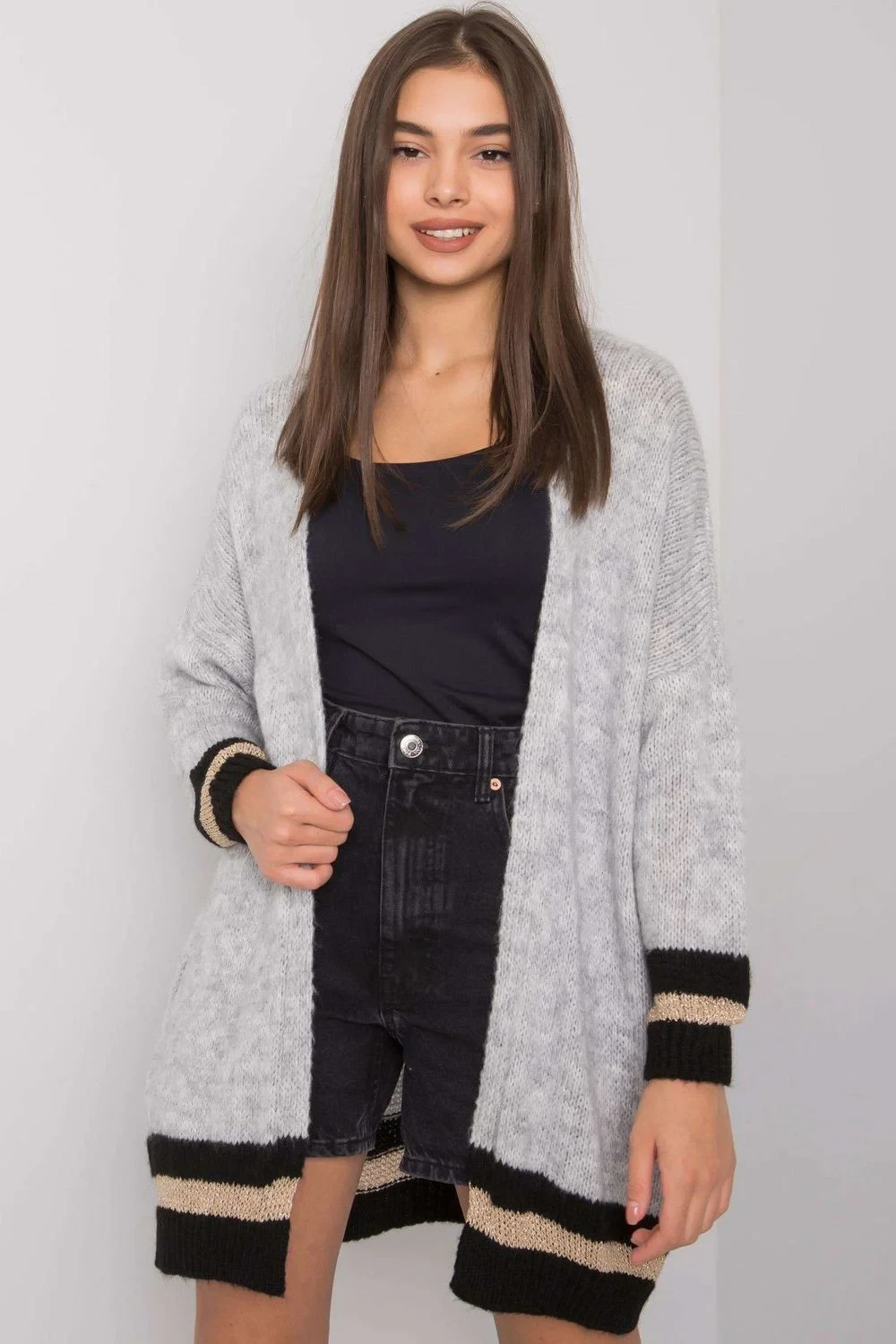 Šedý pletený svetr bez zapínání.