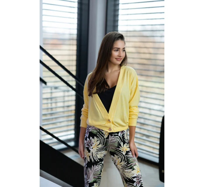 Jednoduchý svetr se dvěma knoflíky ve spodní části. Krátké, do oblasti boků. Hodí se jak jako svetr, tak jako přehoz k pyžamu Ana a Adelina od značky Sensis. Pohodlné, dlouhé rukávy. Krásná slunečná barva.
