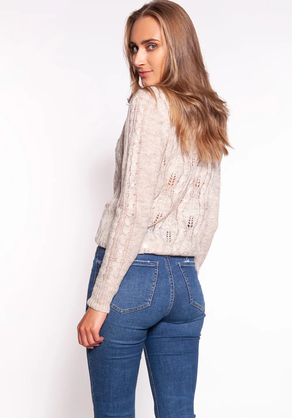 Měkký svetrový kabát z melanžového úpletu. Vyrobeno v polské rodinné manufaktuře. Minimalistický střih s tenkým žebrováním, spadlými rameny a kapsami na bocích.