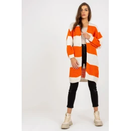 Dlouhý volný svetr s dlouhými rukávy, rozepnutý. Barevný pruhovaný svetr.