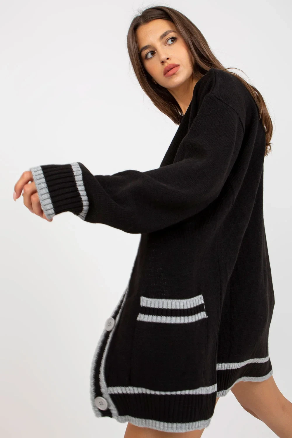 Svetr s dlouhými rukávy, zapínání na knoflíky, boční kapsy. Svetr s kontrastními lemy.