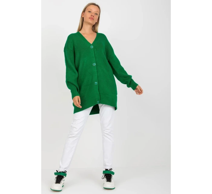 Kardigan s prodlouženým střihem, zapínáním na knoflíky a dlouhými rukávy.
