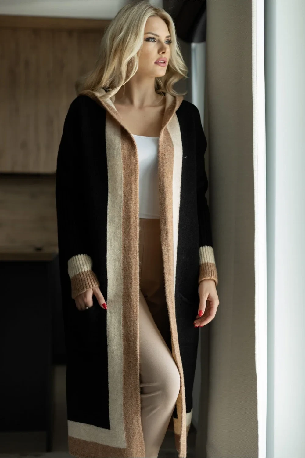 Volný svetr s dlouhými rukávy a kapucí. Rozepínací svetr s nakládanými kapsami. Svetr je měkký a nadýchaný na dotek.