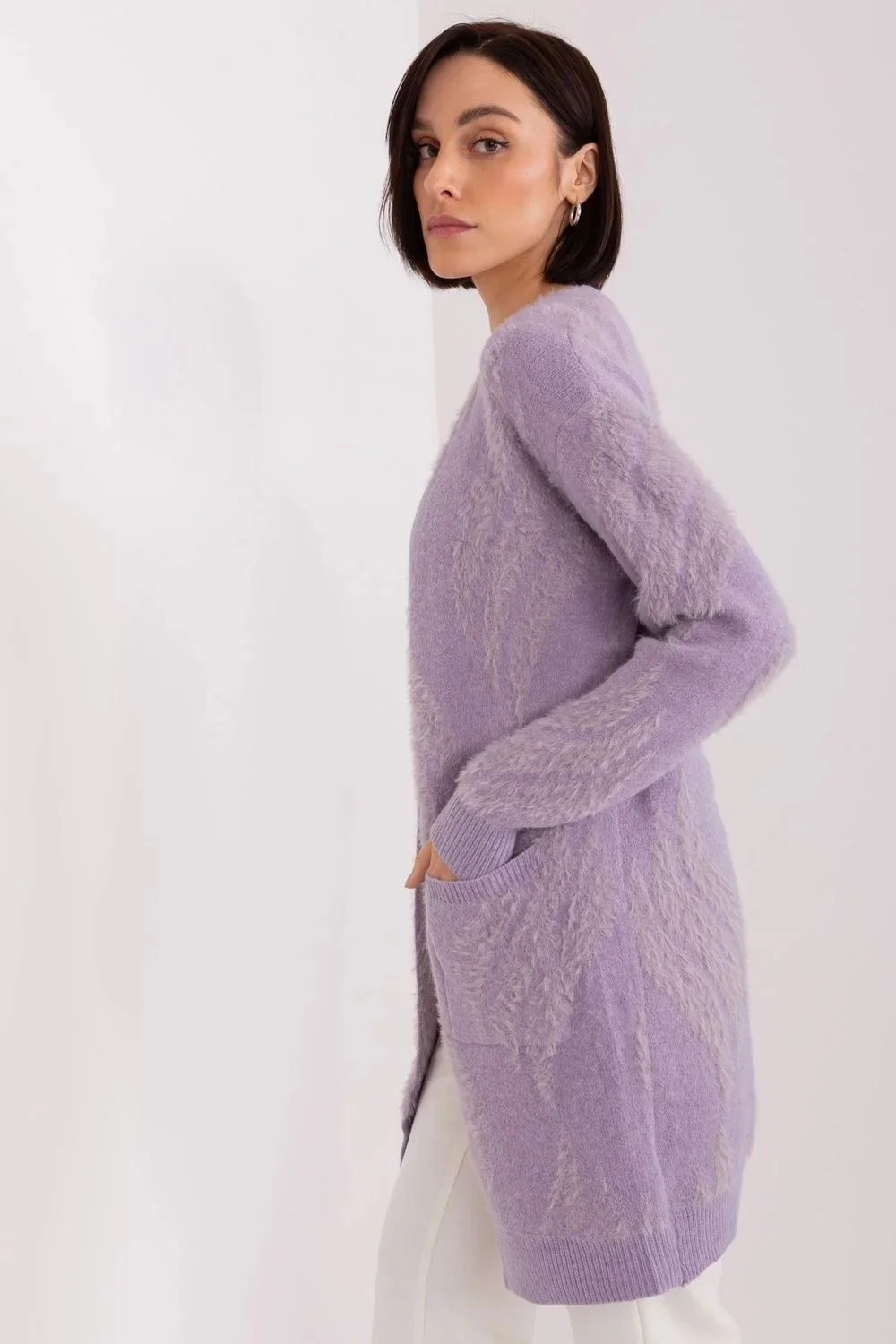Tento svetr s přehozem je dokonalým kouskem do šatníku pro každodenní nošení. Je vyroben z pestré tkaniny, je pohodlný a módní. Dlouhý rukáv a délka sahající přes boky zajišťují teplo a pohodlí. Je to ideální kousek, který přes sebe můžete přehodit v chladnějších dnech nebo večer. Kardigan nemá zapínání, což mu dodává na ležérnosti a volnosti při nošení. Praktickým prvkem jsou navíc nakládané kapsy, do kterých si můžete uložit drobnosti nebo zahřát ruce. Je to pohodlná a módní volba, která doplní mnoho každodenních vzhledů.