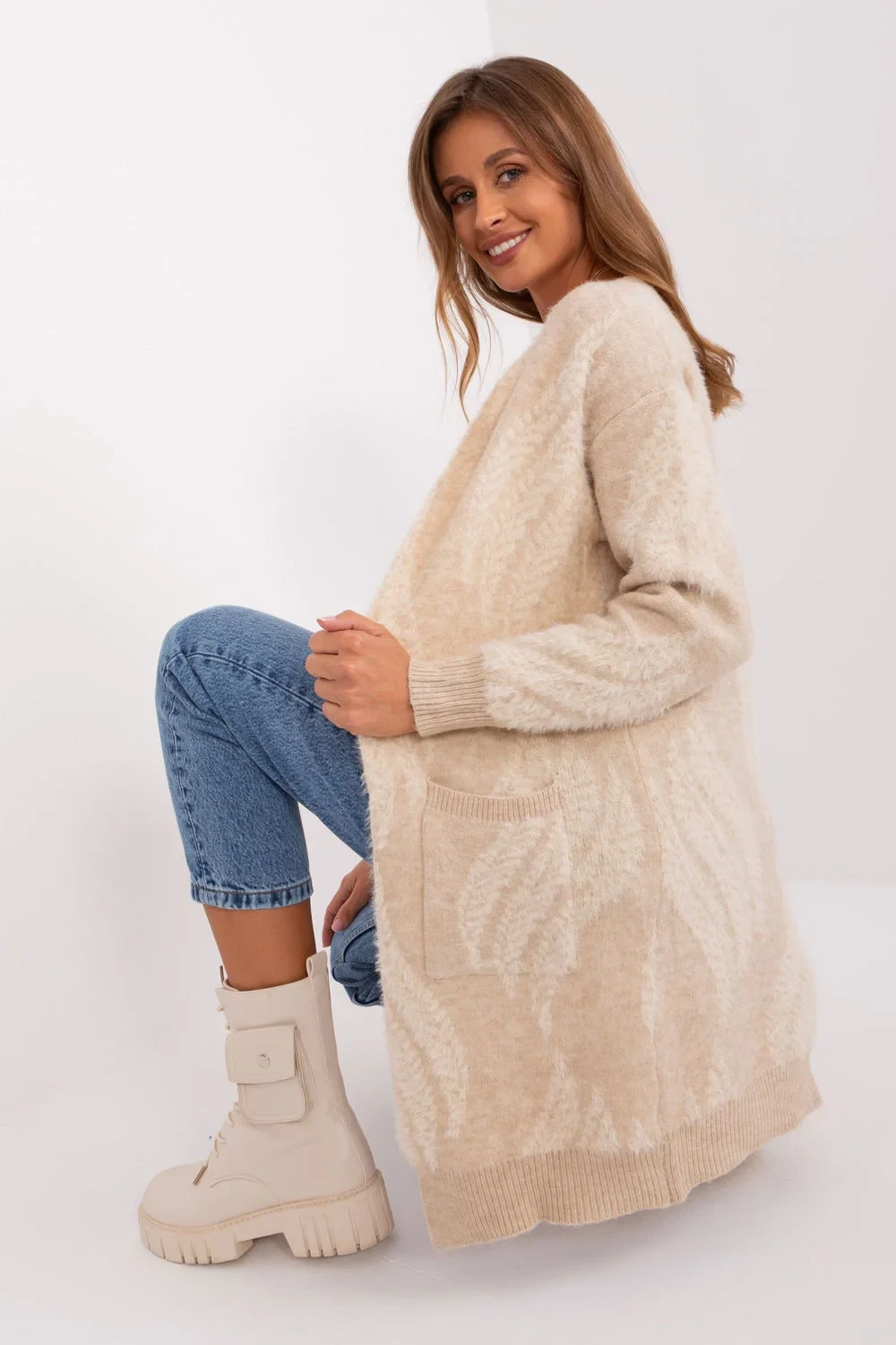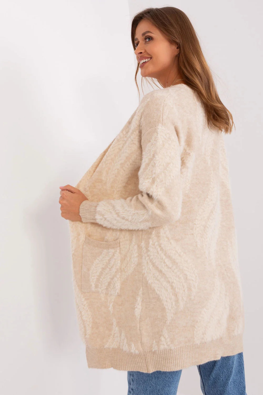 Tento svetr s přehozem je dokonalým kouskem do šatníku pro každodenní nošení. Je vyroben z pestré tkaniny, je pohodlný a módní. Dlouhý rukáv a délka sahající přes boky zajišťují teplo a pohodlí. Je to ideální kousek, který přes sebe můžete přehodit v chladnějších dnech nebo večer. Kardigan nemá zapínání, což mu dodává na ležérnosti a volnosti při nošení. Praktickým prvkem jsou navíc nakládané kapsy, do kterých si můžete uložit drobnosti nebo zahřát ruce. Je to pohodlná a módní volba, která doplní mnoho každodenních vzhledů.