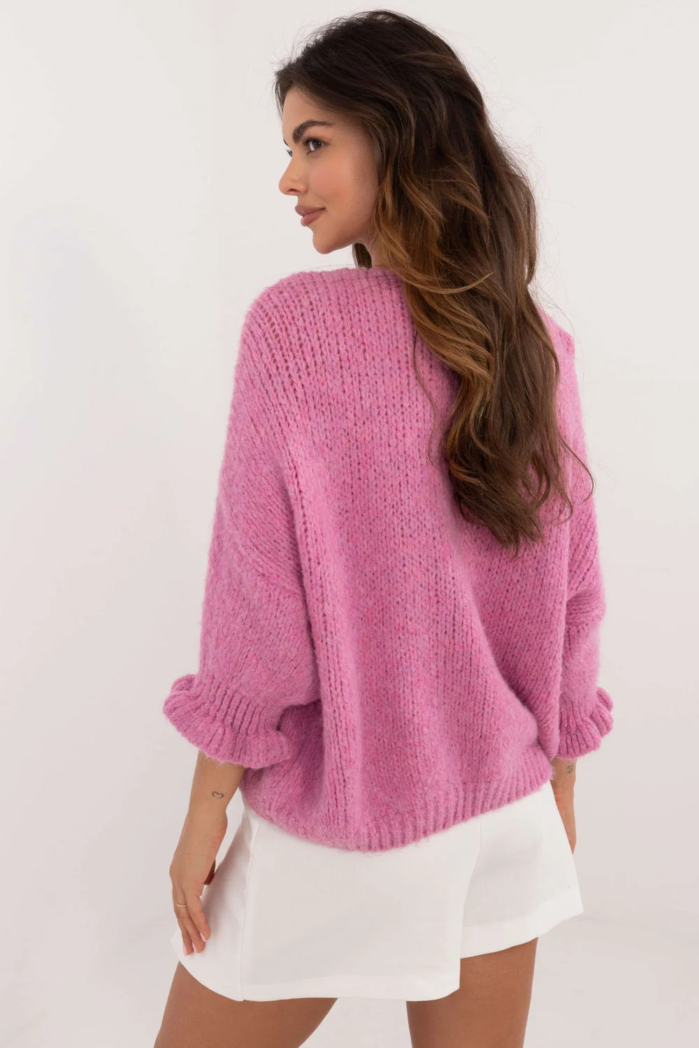 Dámský volný svetr, ideální na každodenní příležitosti. Vyznačuje se hladkým vzorem, což mu dodává minimalistický a univerzální charakter. Vyrobený z měkkého akrylu, poskytuje pohodlí a komfort nošení každý den. Svetr má standardní délku a rukávy délky 3/4, které přidávají lehkost a volný styl. Místo tradičních knoflíků má svetr šňůrky na tři provázky, což mu dodává originalitu a módní vzhled. Ideální volba pro každodenní volné styly.