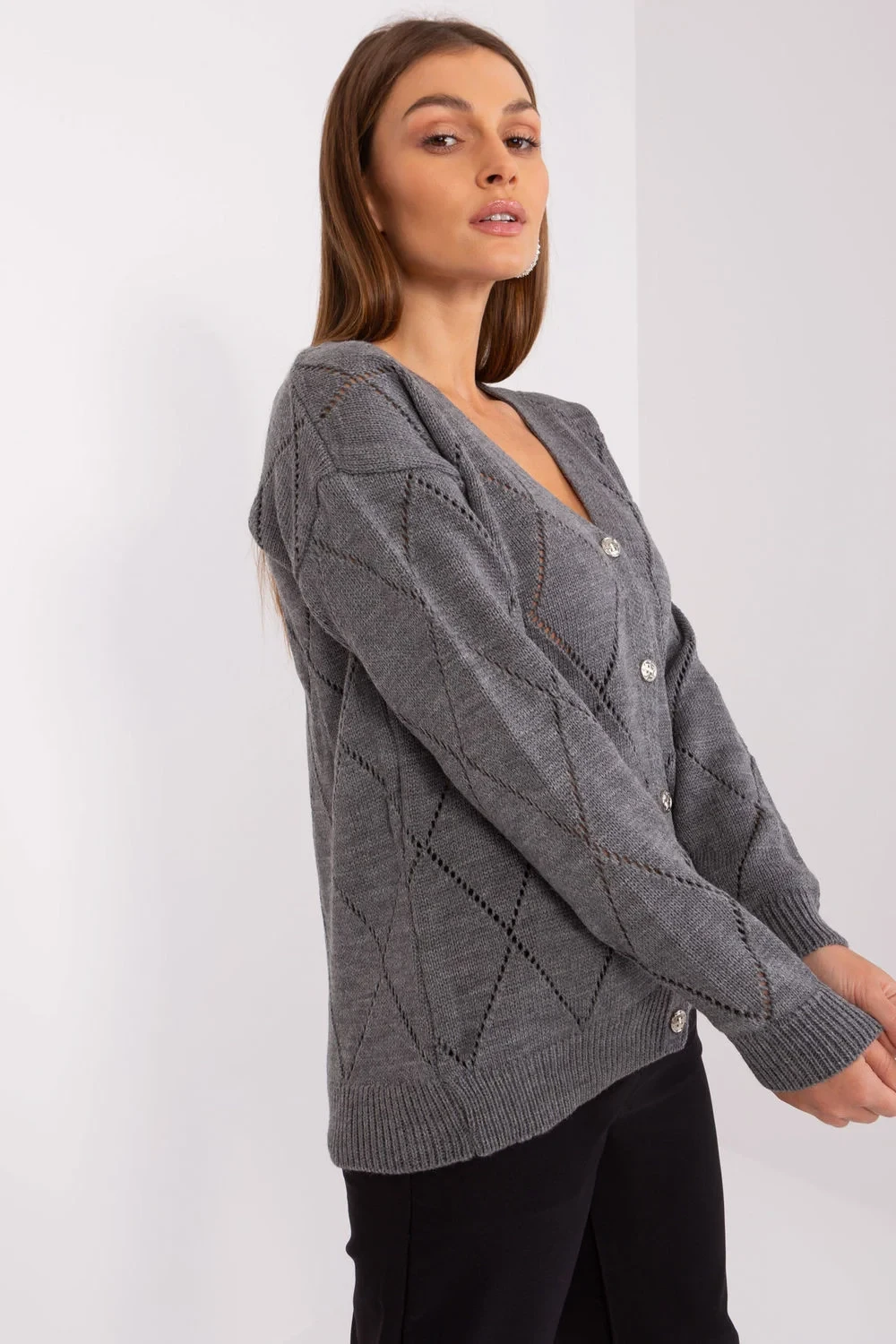 Elegantní a stylový dámský rozepínací svetr je ideální volbou na chladnější dny. Vyrobený z kombinace akrylu a vlny poskytuje teplo, zároveň zůstává lehký a prodyšný. Vzor s dírkami mu dodává jemnou eleganci a skvěle ladí jak s každodenními, tak s ženskými styly. Svetr má standardní délku, dlouhý rukáv a výstřih do srdíčka, který zvýrazňuje krk a dodává mu klasický šarm. Zapínání na knoflíky umožňuje různé způsoby nošení, jak rozepnutý, tak zapnutý pro větší pohodlí. Jedná se o nadčasový kousek šatníku, který se skvěle hodí do každodenních outfitů, zajišťuje pohodlí a stylový vzhled.