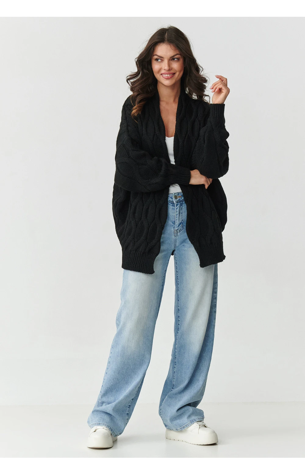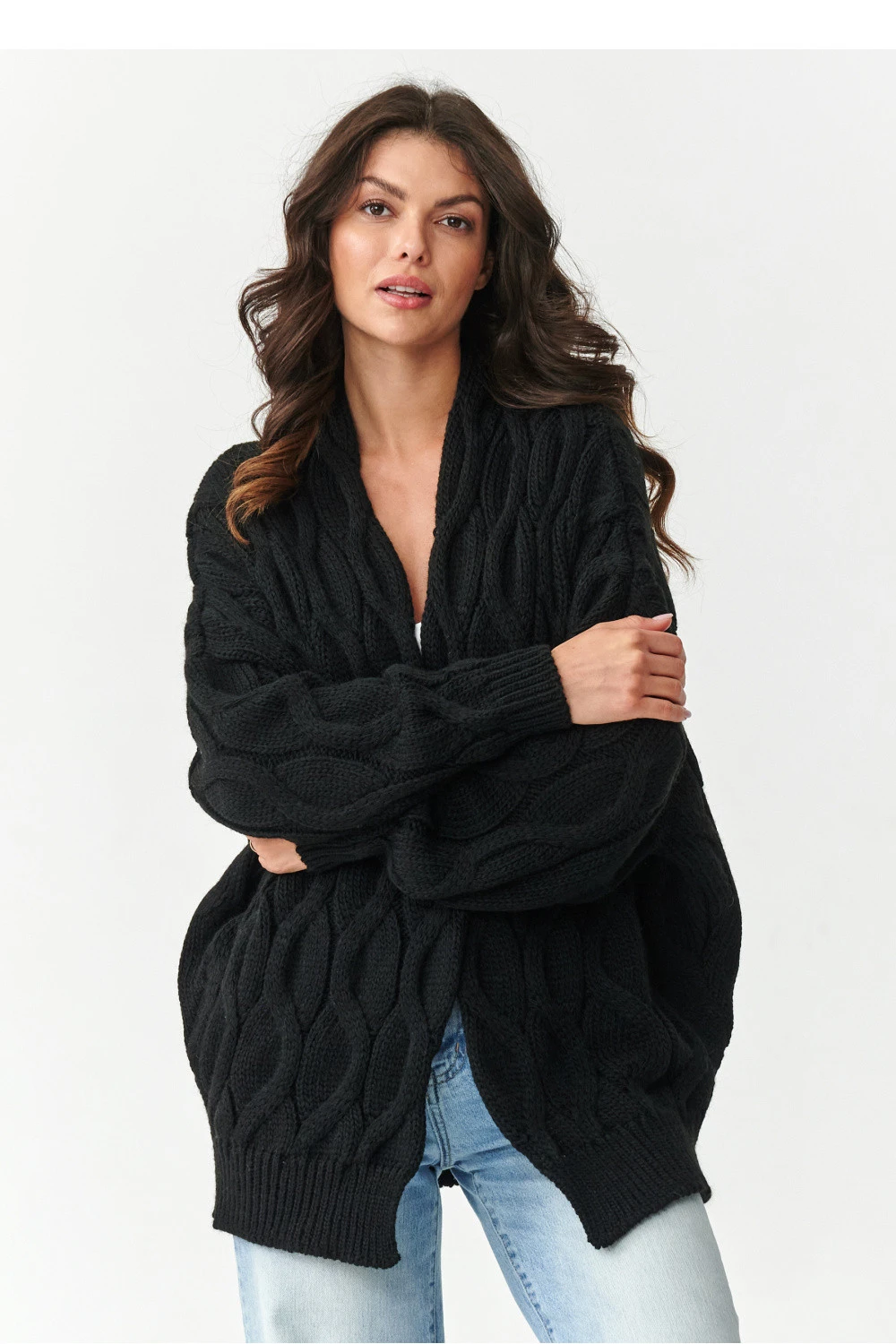 Stylový, teplý a nesmírně pohodlný dámský kardigan je must-have v každém podzimně-zimním šatníku. Vyrobený z vysoké kvality příze s obsahem 85% akrylu a 15% polyamidu, ohromuje měkkostí, trvanlivostí a odolností proti deformacím. Charakteristický hrubý vzor ve formě copánkových copánků mu dodává nezaměnitelný charakter a dělá každý outfit módním a útulným. Díky oversized střihu svetr zaručuje volnost pohybu a pohodlí nošení, a absenci zapínání lze snadno kombinovat s tričkem, topem nebo elegantní košilí. Jedná se o skvělý návrh jak na každý den, tak na chladné večery. Kardigan je k dispozici v několika základních odstínech: béžový melír, cappuccino, černý, šedivý melír a šedý melír, díky čemuž každá žena najde barvu, která odpovídá jejímu stylu.