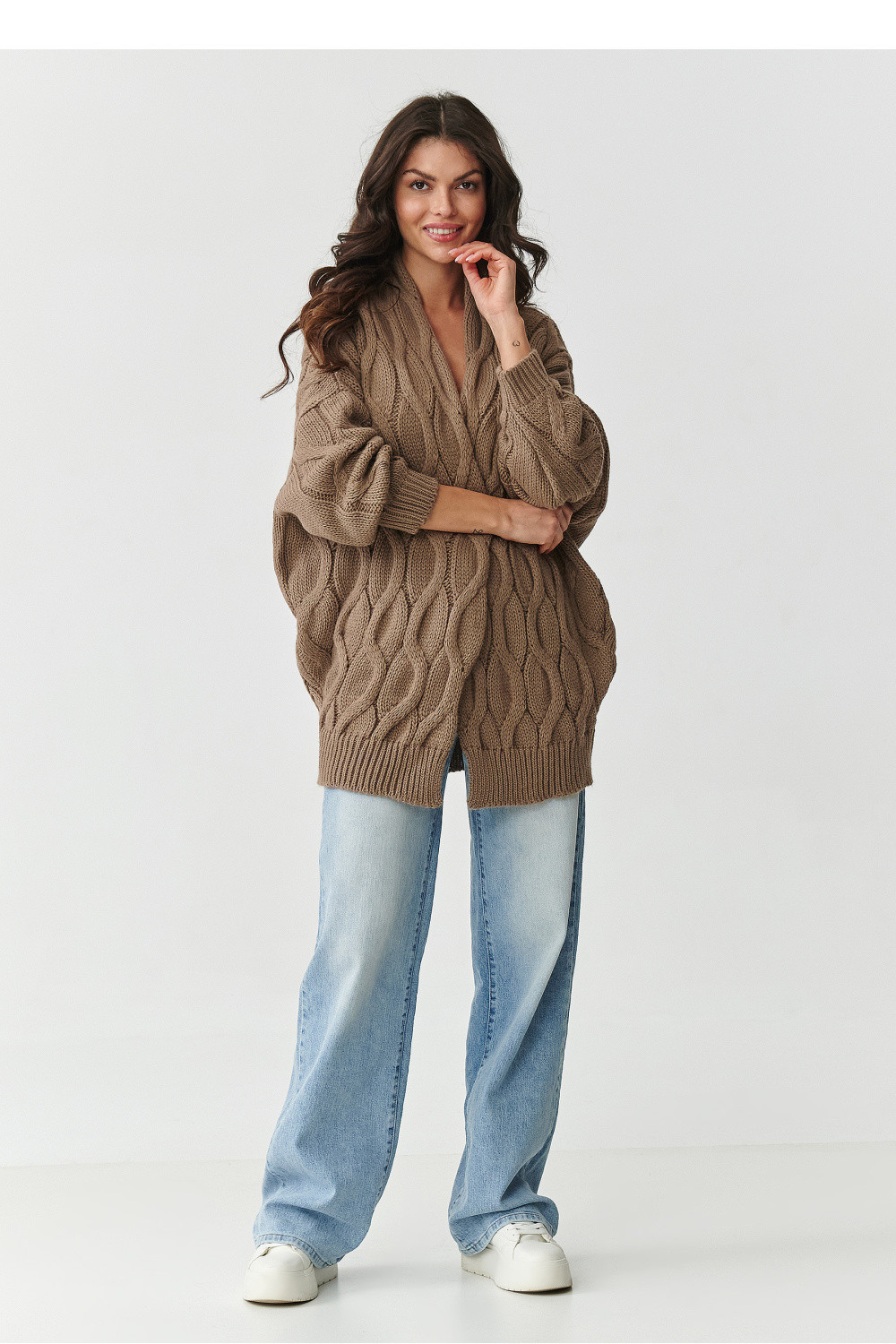 Stylový, teplý a neuvěřitelně pohodlný dámský kardigan je must-have v každé podzimně-zimní garderobě. Vyrobený z vysoce kvalitní příze o složení 85 % akryl a 15 % polyamid, ohromuje měkkostí, trvanlivostí a odolností proti deformacím. Charakteristický hrubý vzor ve formě copánkových pletenin mu dodává jedinečný charakter a zajišťuje, že každý outfit vypadá módně a útulně. Díky oversized střihu svetr zaručuje volnost pohybu a pohodlí nošení, a absenci zapínání lze snadno kombinovat s tričkem, topem nebo elegantní košilí. Jedná se o skvělou volbu jak na každý den, tak na chladné večery. Kardigan je k dispozici v několika základních odstínech: béžový melír, cappuccino, černý, grafitový melír a šedý melír, díky čemuž každá žena najde barvu, která ladí s jejím stylem.