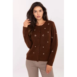 Půvabný dámský svetr s volným střihem, ideální na každodenní outfit. Vyrobený z příjemné směsi polyesteru, akrylu a vlny, která poskytuje teplo a pohodlí. Model má standardní délku, dlouhý rukáv a kulatý výstřih, jehož přední část a rukávy zdobí vyšívaná srdíčka, dodávající celku dívčí půvab. Zapínání na knoflíky zdůrazňuje klasický střih a dělá svetr skvěle sladěný jak s džínami, tak s sukní.